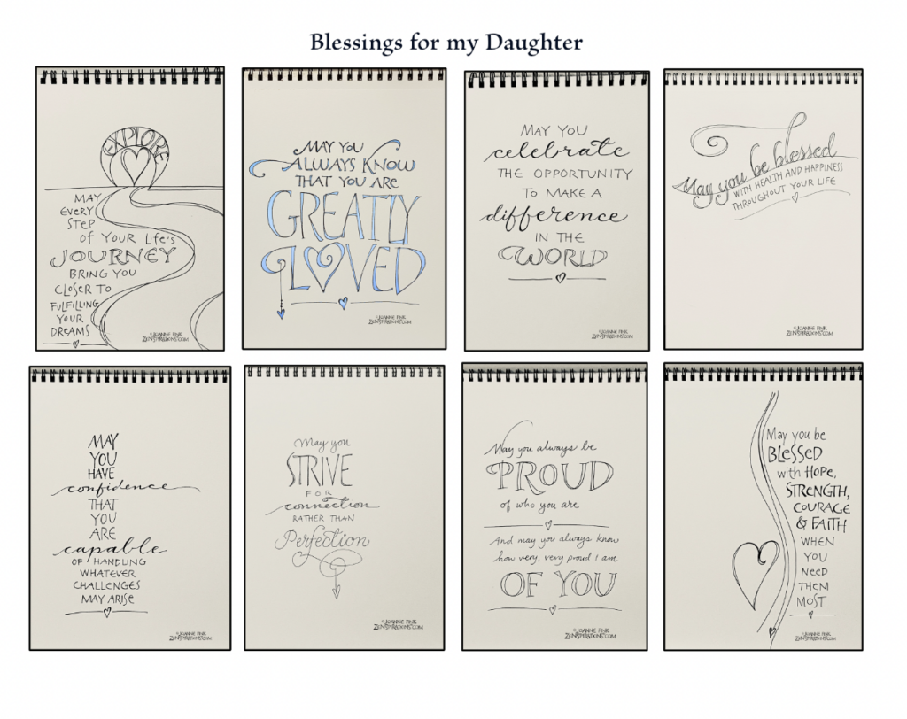 Another blessing practice that is an important and grounding part of my life is to create and send my daughter a hand-lettered doodle every night before going to sleep. These nightly messages fall into different categories: advice, blessings, encouragement, gratitude, inspiration, questions, and of course a weekly ‘Shabbat Shalom‘ and ‘Shavua Tov’ greeting. I looked through some of the ‘doodles’ I’ve sent in the past few years, and pulled a few of the blessings to share: