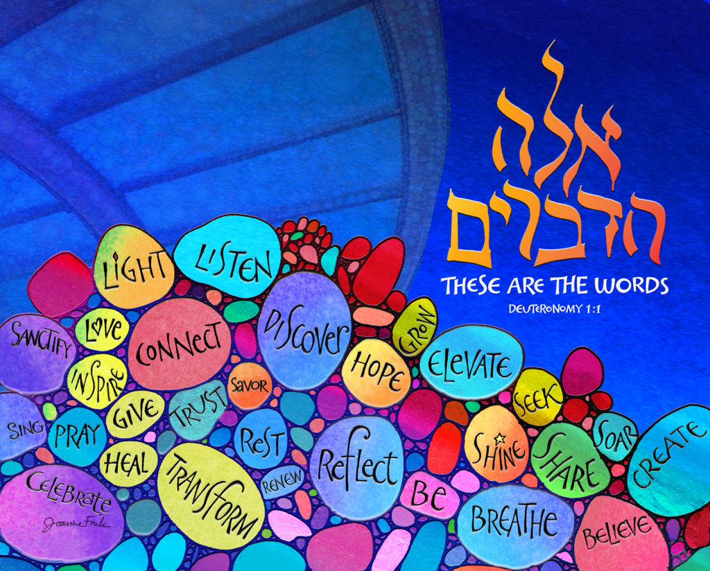I have a sacred kavannah (intention) to create art and liturgy that uplift, inspire, and encourage. For my illustration of Parashat Devarim—“These are the words…” (Deuteronomy 1:1)—I added 29 words that resonate with me: