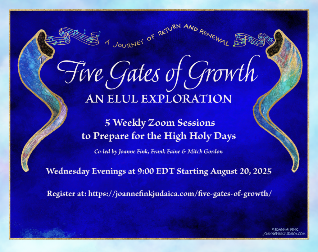 As Tisha B’Av marks the low point of our calendar year, the healing journey toward Elul and t’shuvah—return—begins. I’m honored to be co-leading a five-week Zoom Elul Explorations series, Five Gates of Growth, with my friends Mitch Gordon and Franklin Faine. Together, we’ll explore the inner work of t’shuvah and the ways in which we can realign our lives with intention and love.