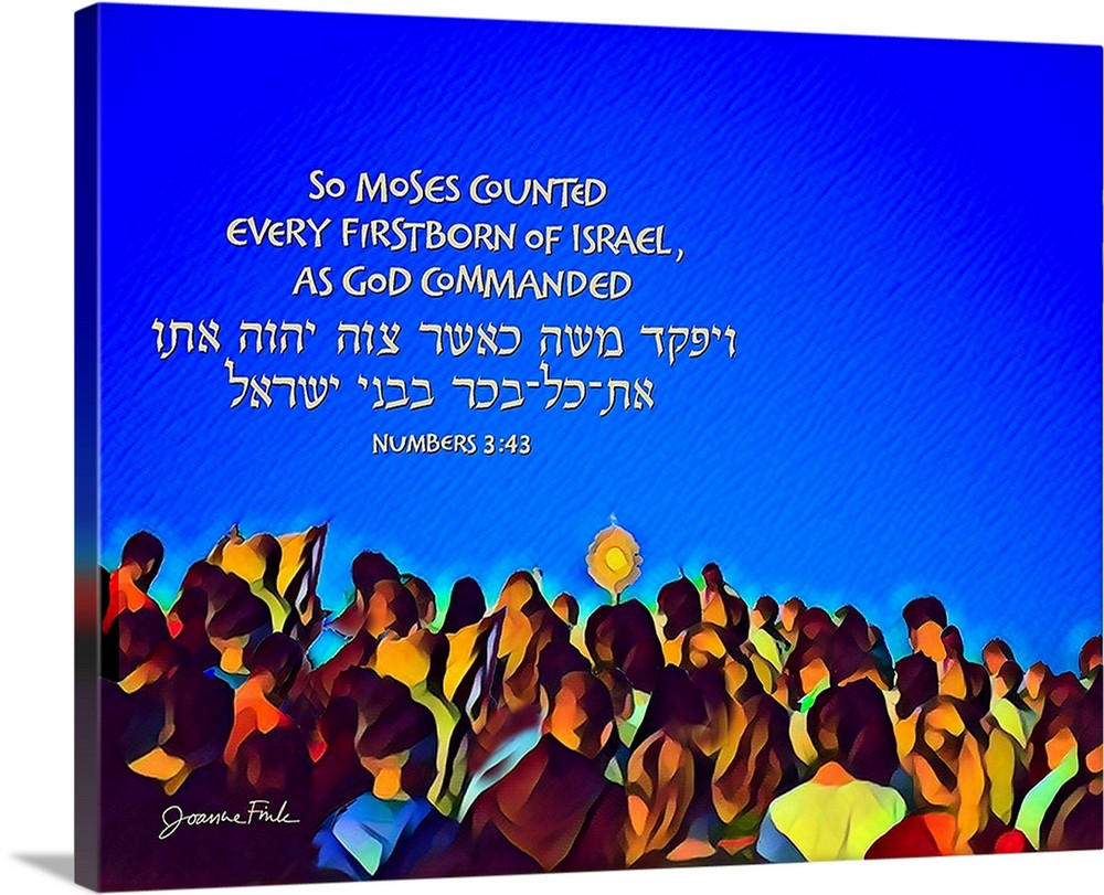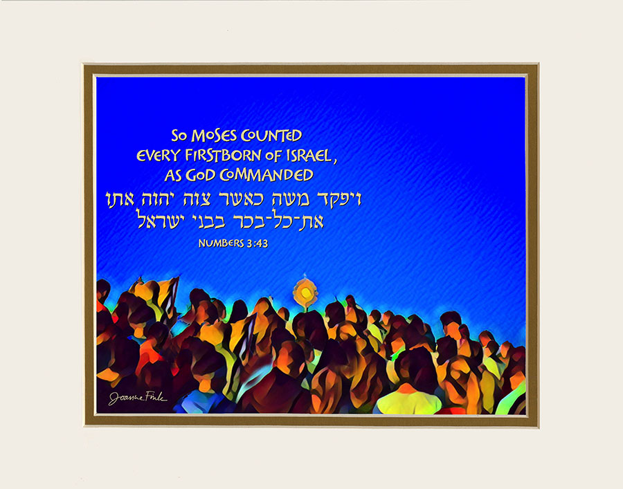 This painterly design is the thirty-fourth of the 54 pieces in Joanne Fink’s Torah Illuminations series. This piece illustrates verse 3:43, from Parasha Bamidbar, the first Torah portion in the Book of Numbers, “So Moses counted every firstborn of Israel as God Commanded.”