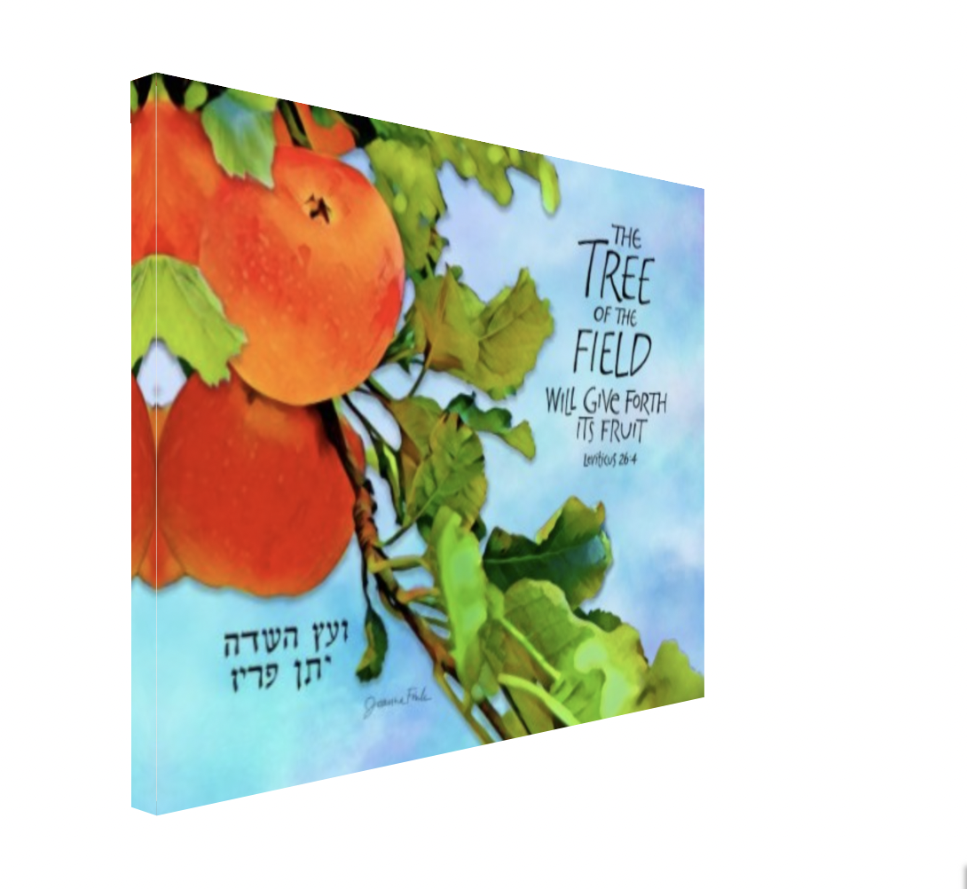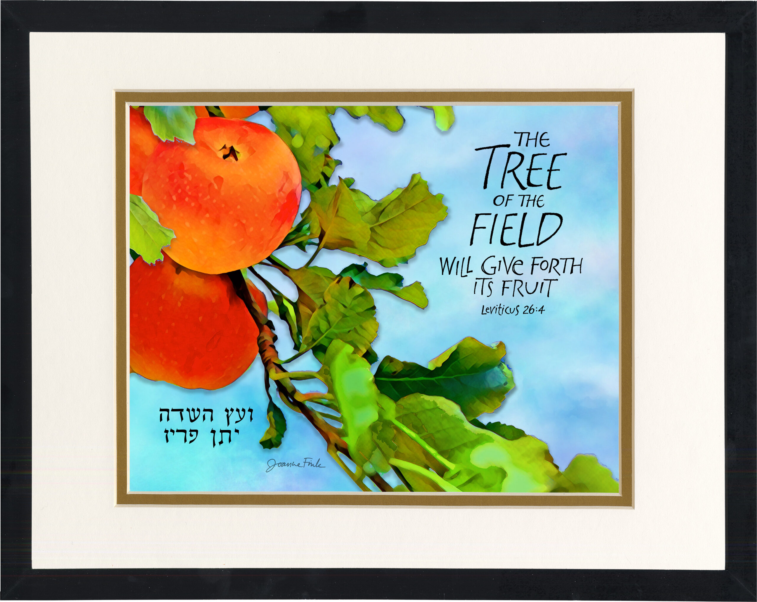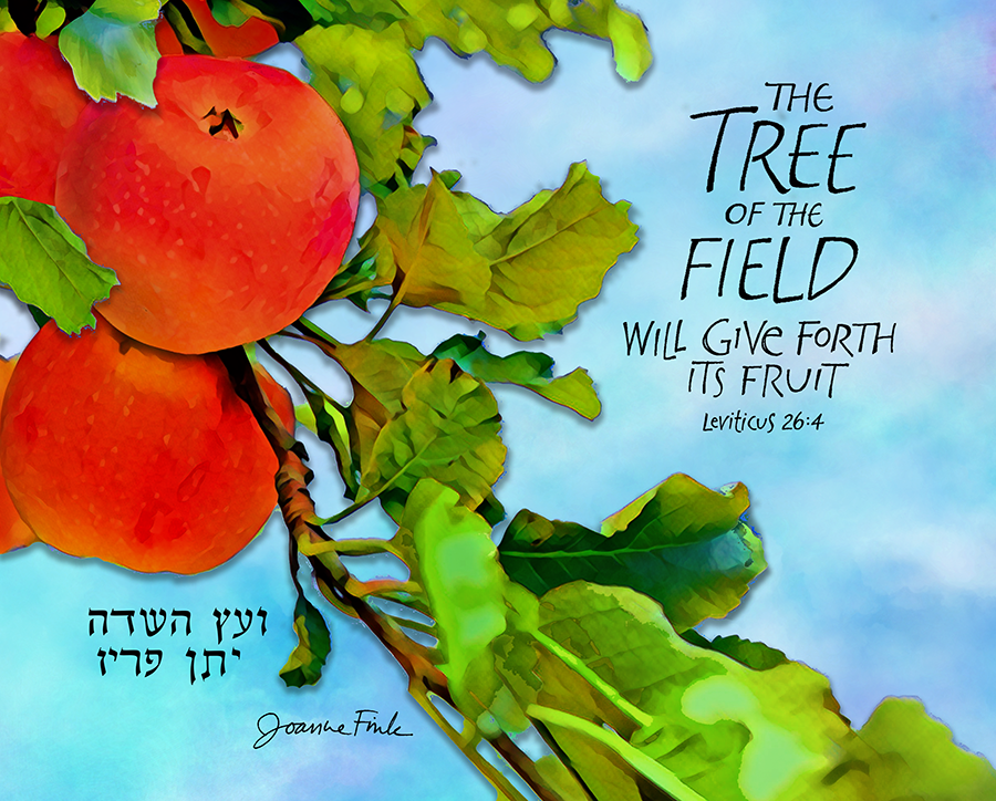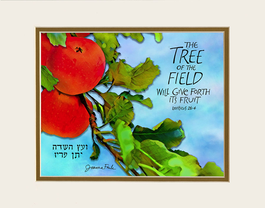 This colorful design is the thirty-third of the 54 pieces in Joanne Fink’s Torah Illuminations series. This piece illustrates verse 26:4, from Parasha Bechukotai, the last Torah portion in the Book of Leviticus, “The tree of the field will give forth its fruit.”
