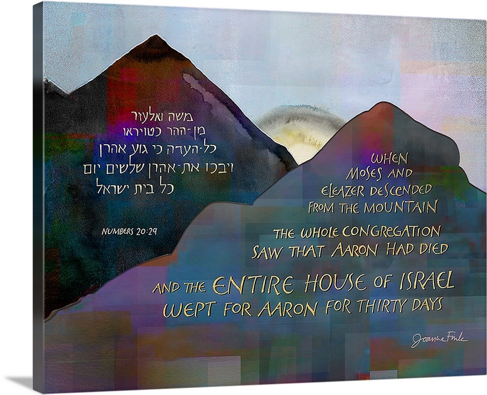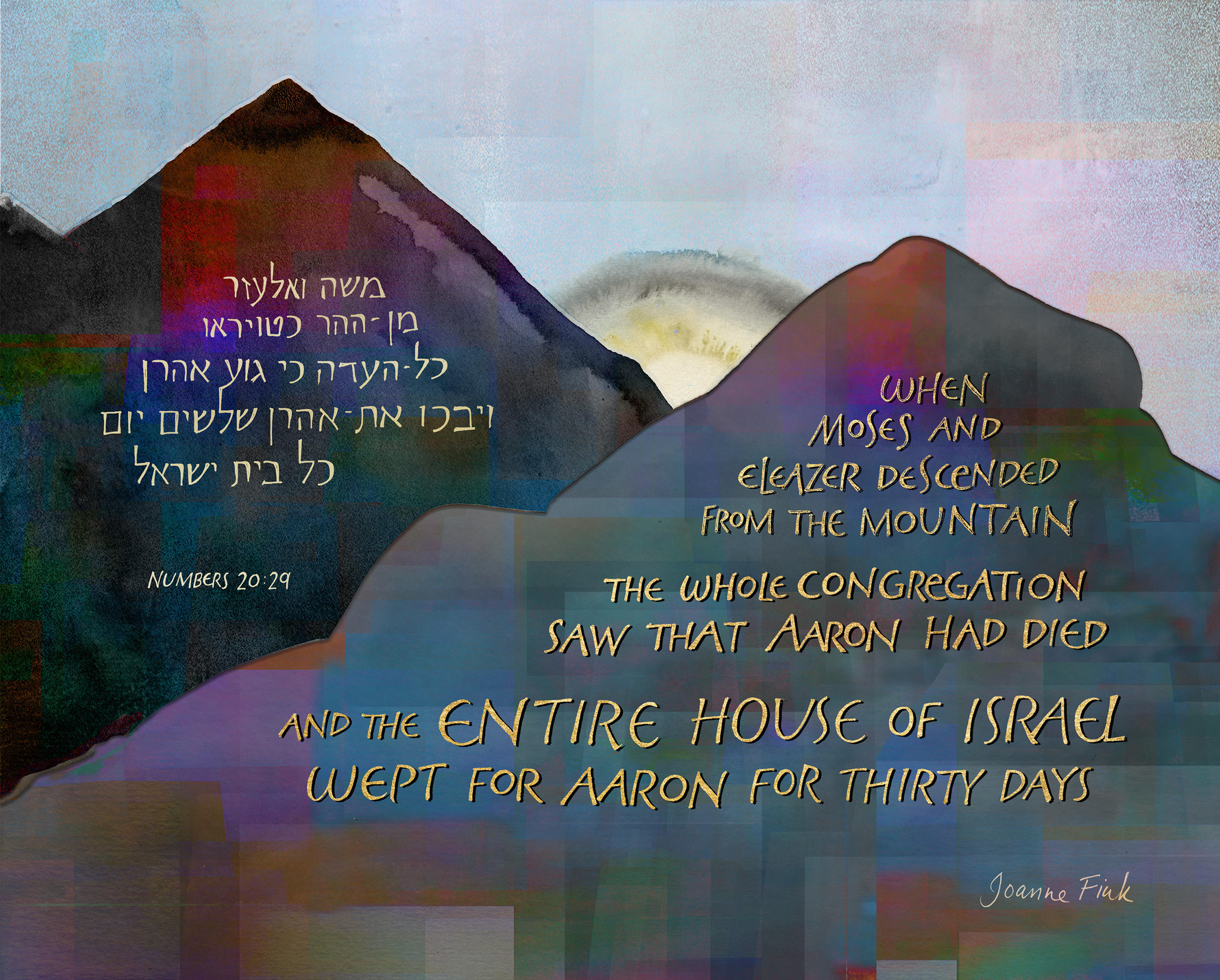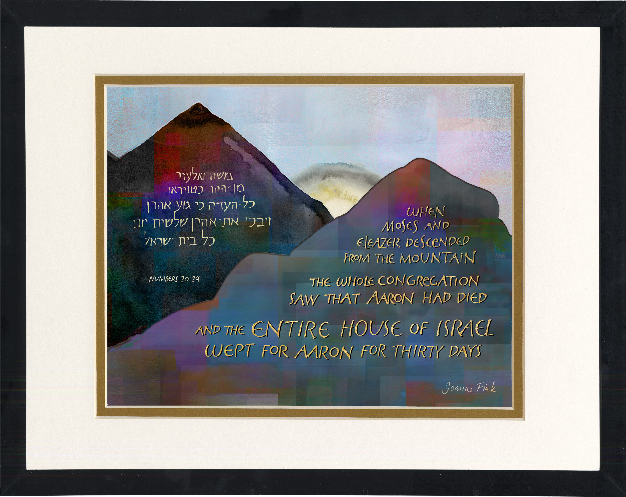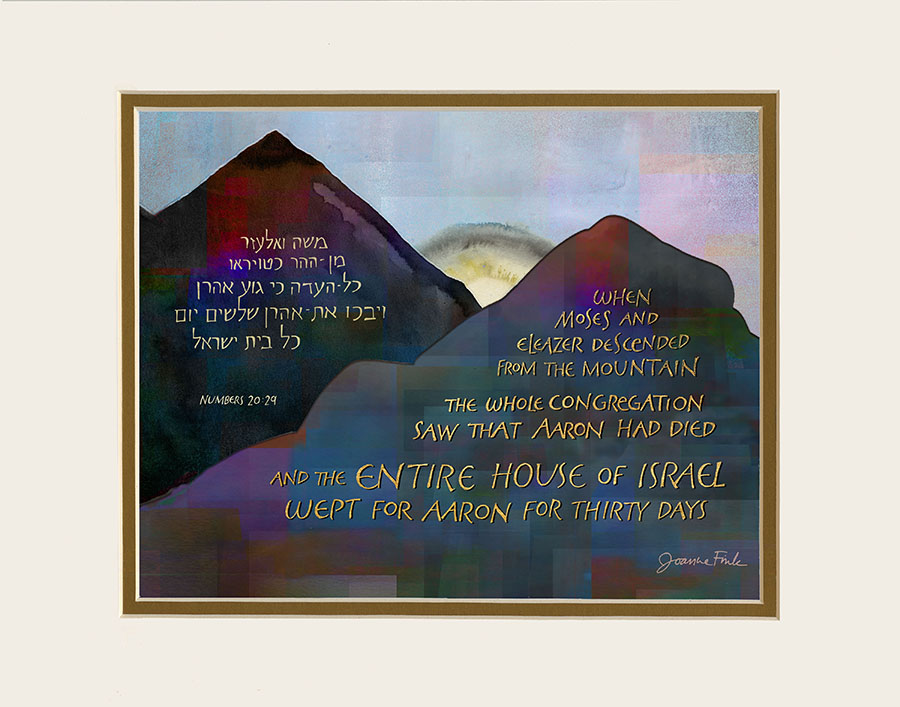 This landscape design is the thirty-ninth of the 54 pieces in Joanne Fink’s Torah Illuminations series. This piece illustrates verses 19:1-22:1, from Parasha Chukat, the sixth Torah portion in the Book of Numbers, “When Moses and Eleazer descended from the mountain the whole congregation saw that Aaron had died and the entire house of Israel wept for Aaron for thirty days.”