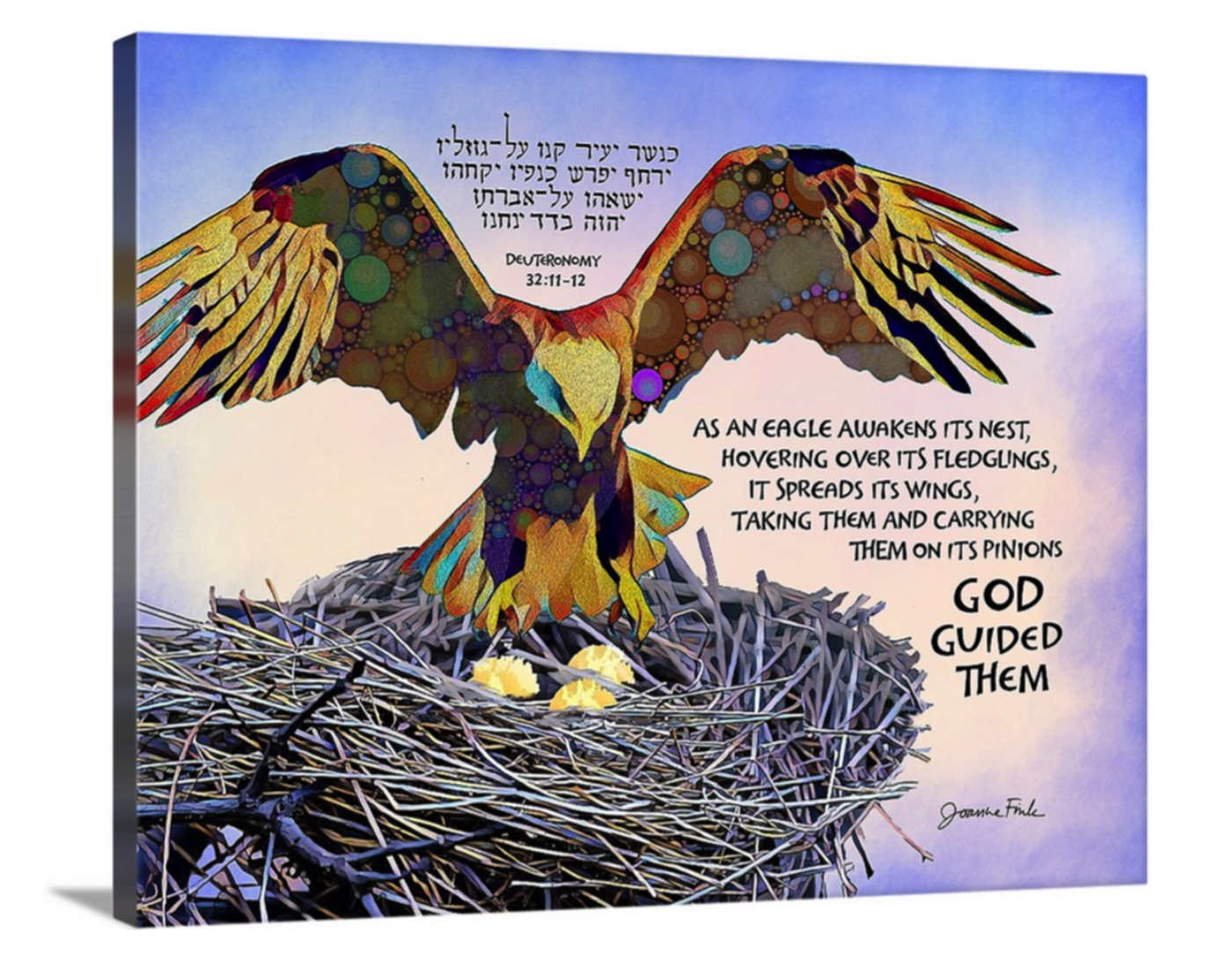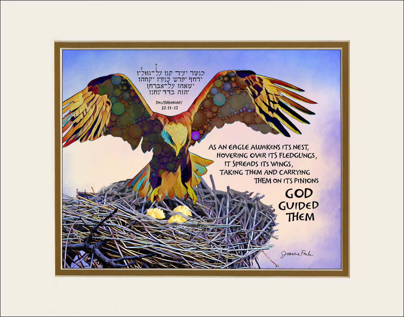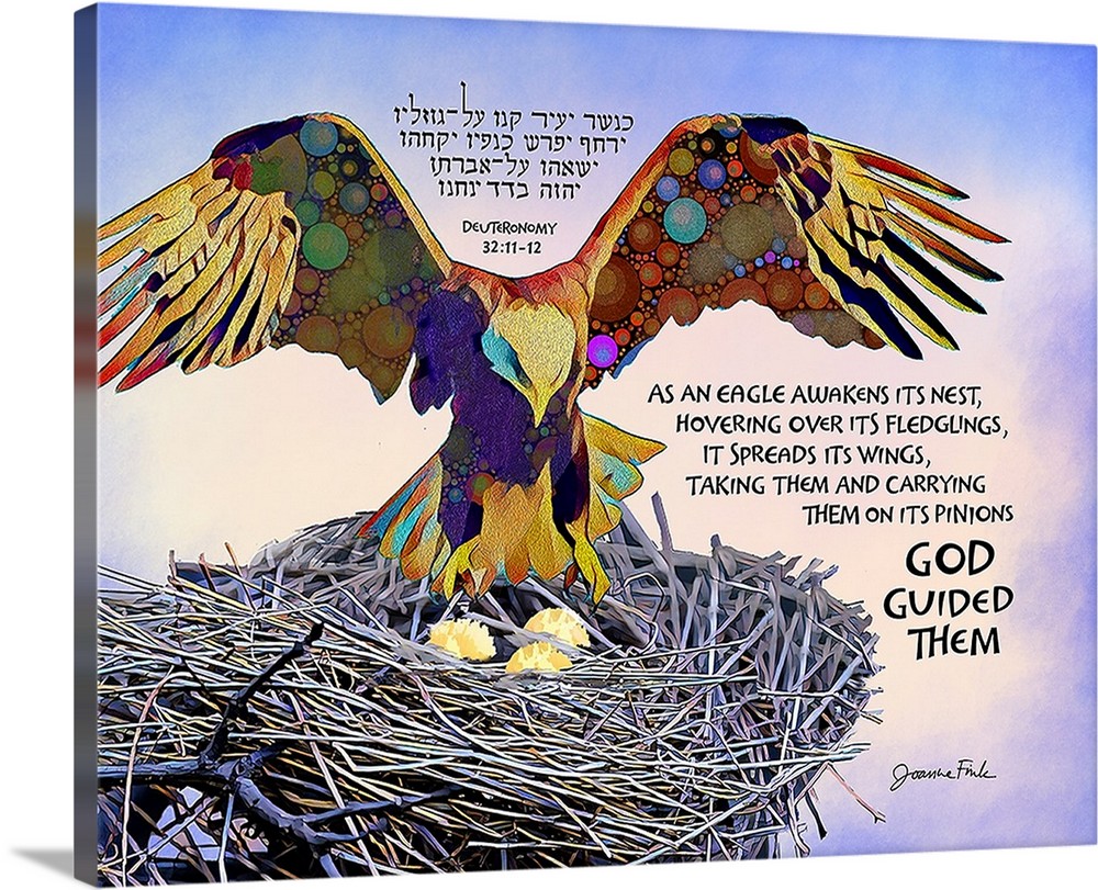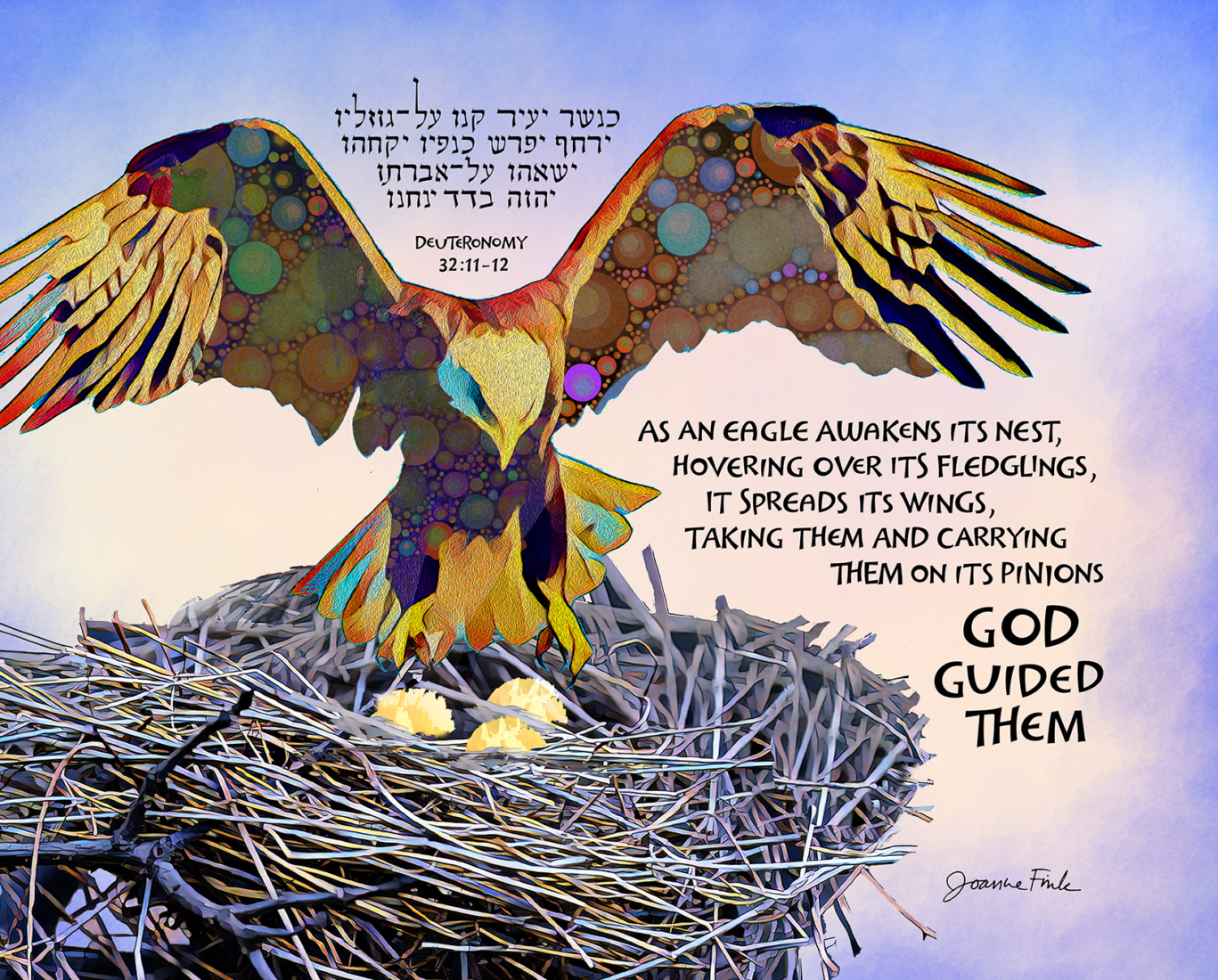 This nature design is the fifty-third of the 54 pieces in Joanne Fink’s Torah Illuminations series. This piece illustrates verses 32.11-12, from Parasha Haazinu, the tenth Torah portion in the Book of Deuteronomy, “As an eagle awakens its nest, hovering over its fledglings, it spreads its wings, taking them and carrying them on its pinions.”