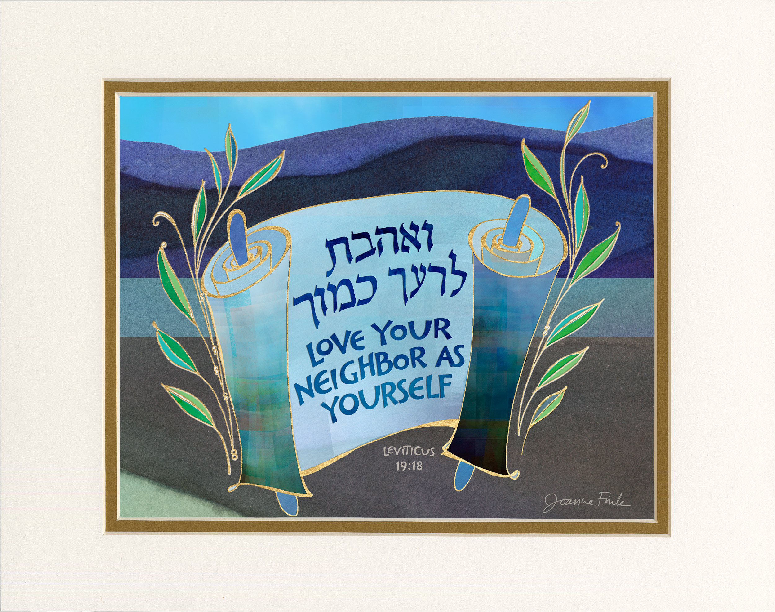 This delightful design is the thirtieth of the 54 pieces in Joanne Fink’s Torah Illuminations series. This piece illustrates verse 19:18, from Parasha Kedoshim, the seventh Torah portion in the Book of Leviticus, “Love your neighbor as yourself.”