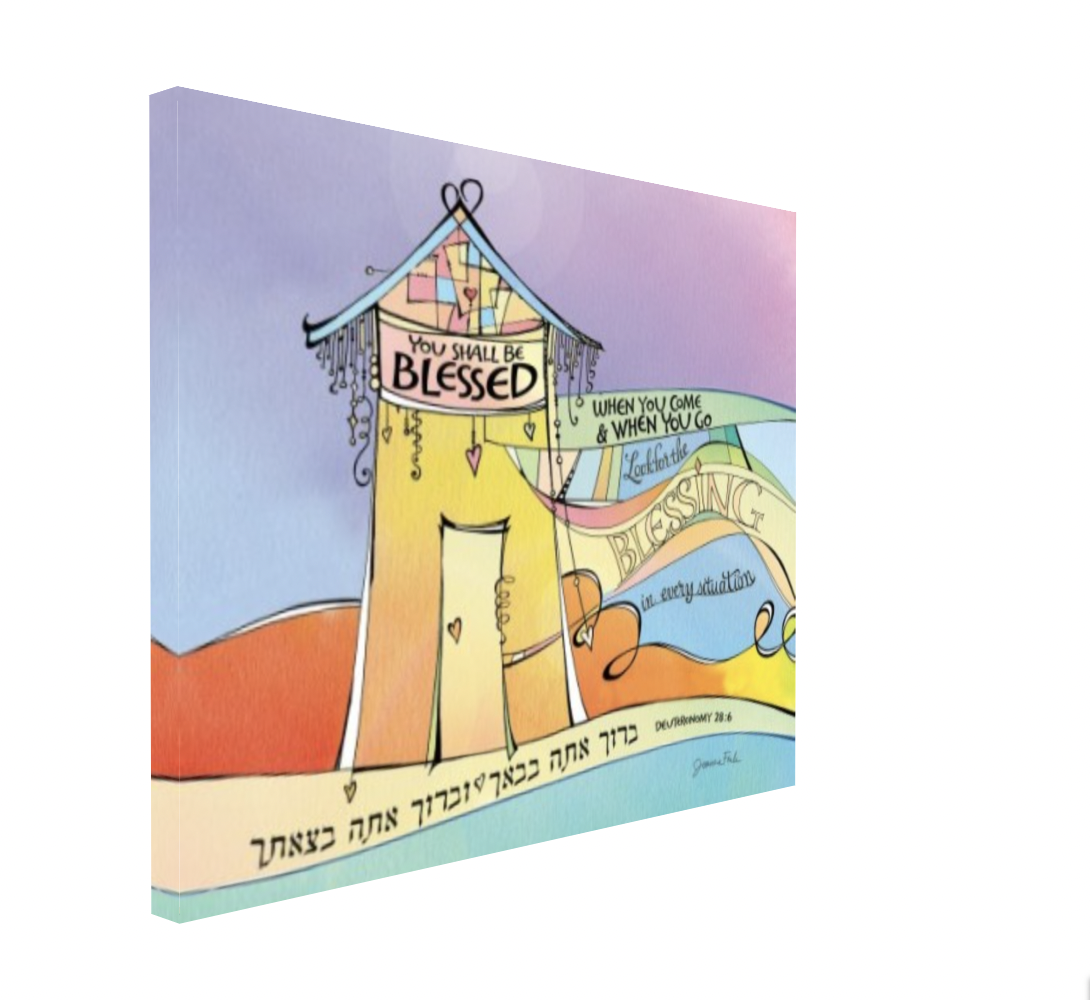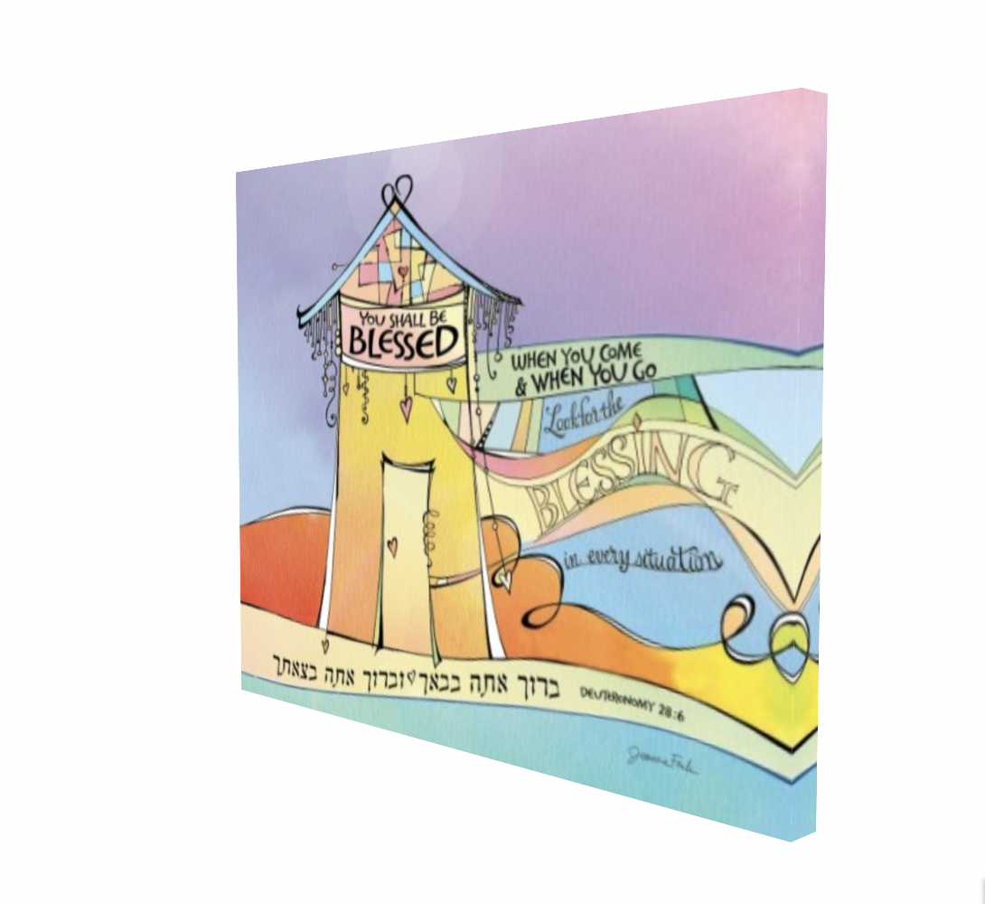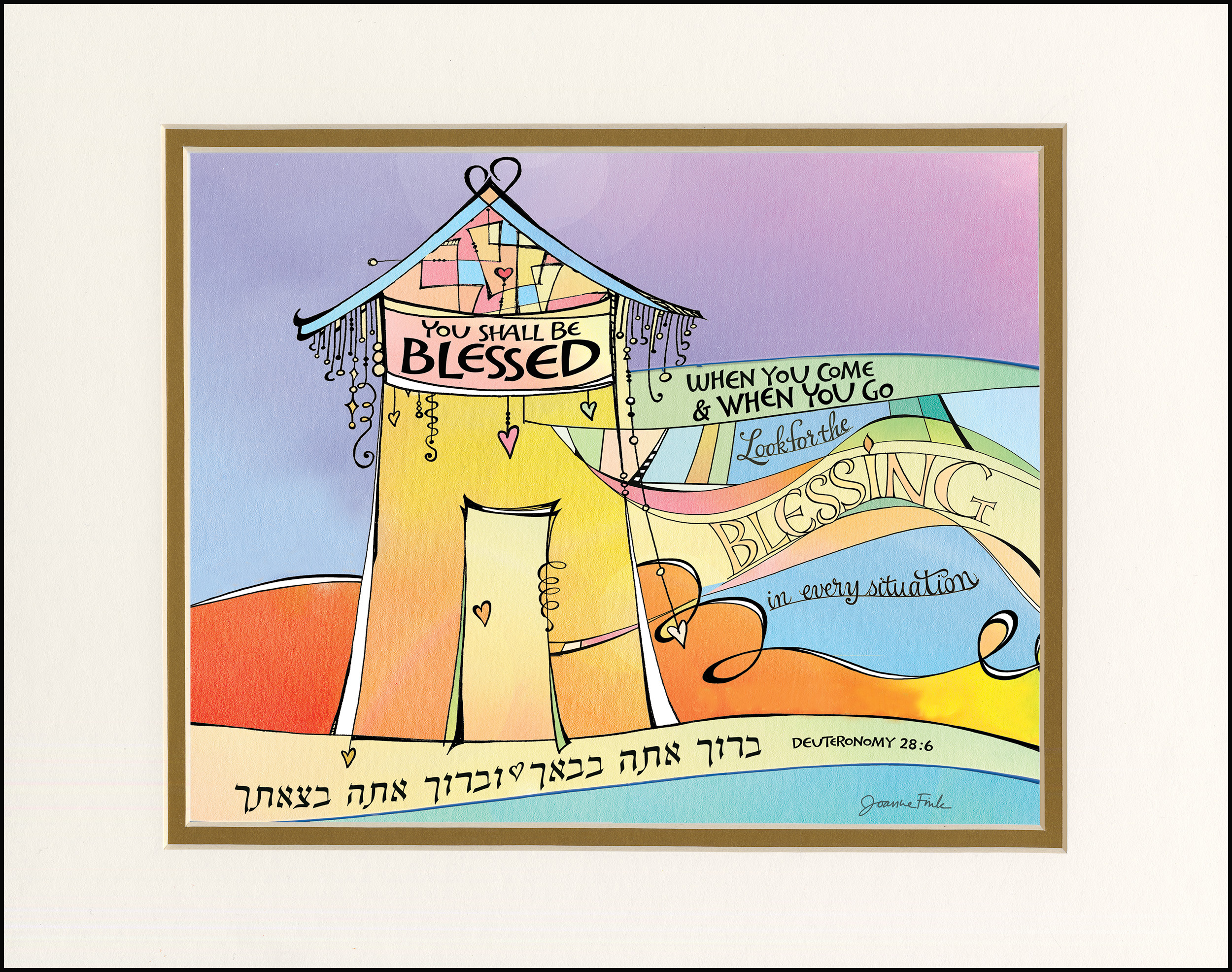 This whimsical design is the fiftieth of the 54 pieces in Joanne Fink’s Torah Illuminations series. This piece illustrates verse 28:6, from Parasha Ki Tavo, the seventh Torah portion in the Book of Deuteronomy, “You shall be blessed when you come and when you go.”
