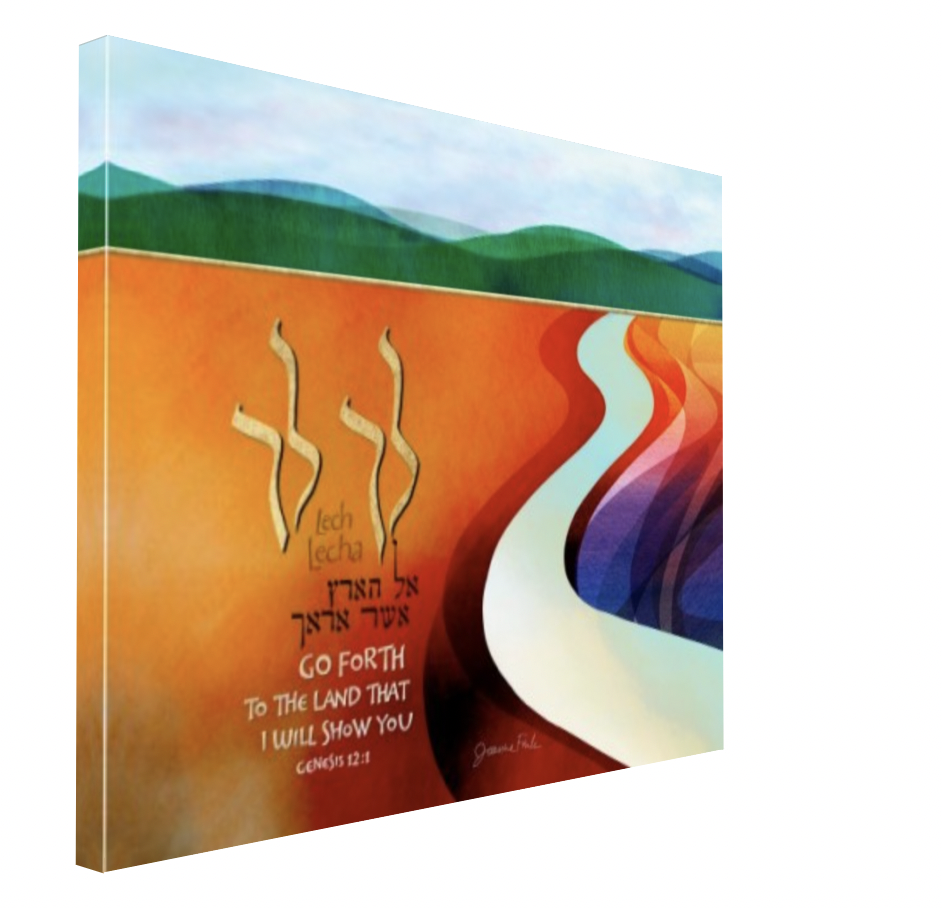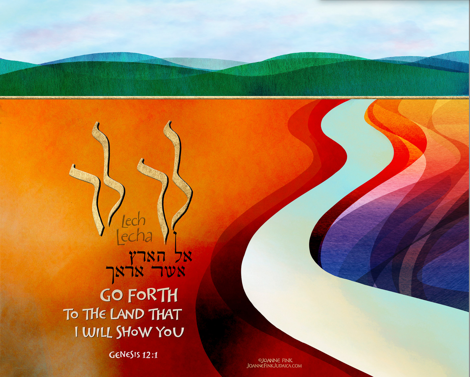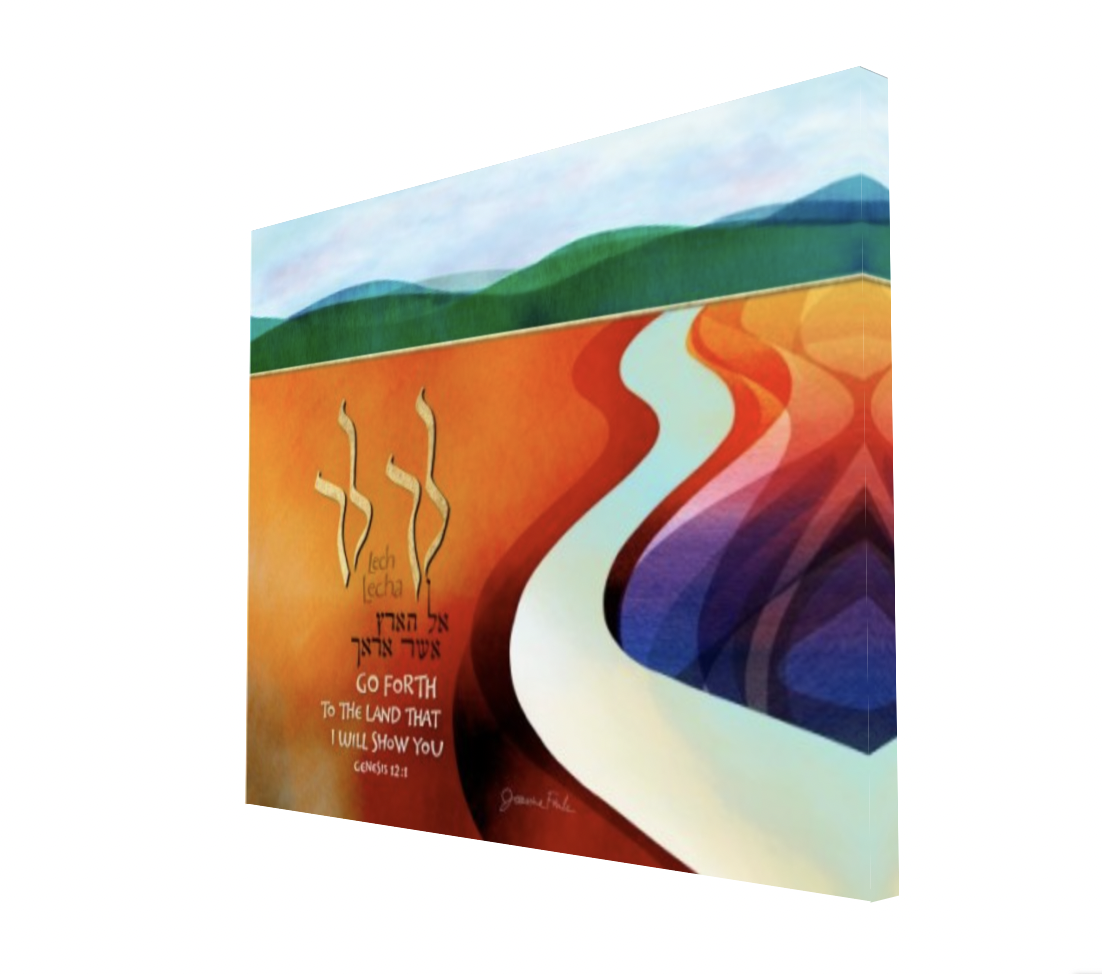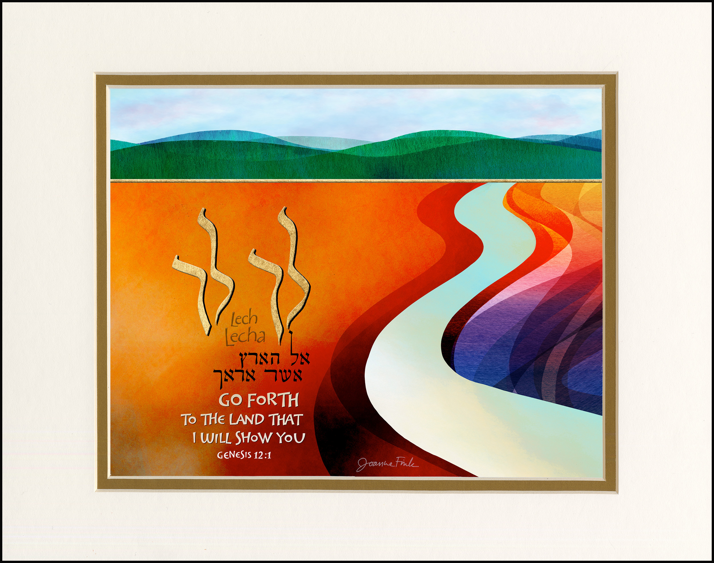 This colorful design is the third of the 54 pieces in Joanne Fink’s Torah Illuminations series. This piece illustrates verse 12:01, from Parasha Lech Lecha, the third Torah portion in the Book of Genesis, “Go forth to the land that I will show you.”