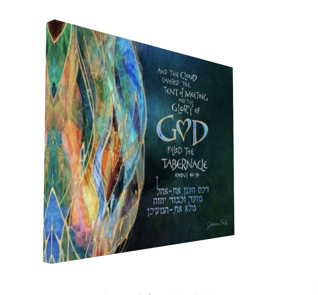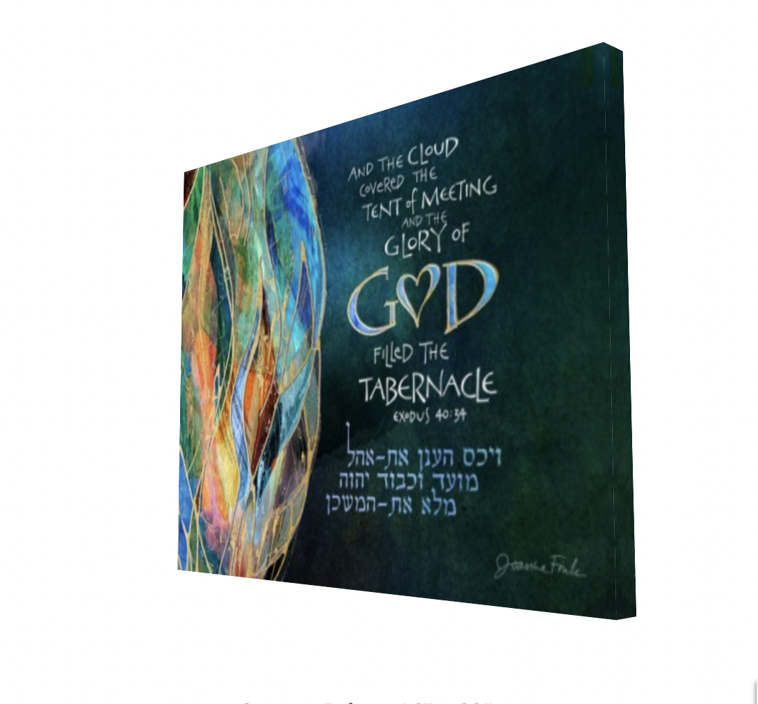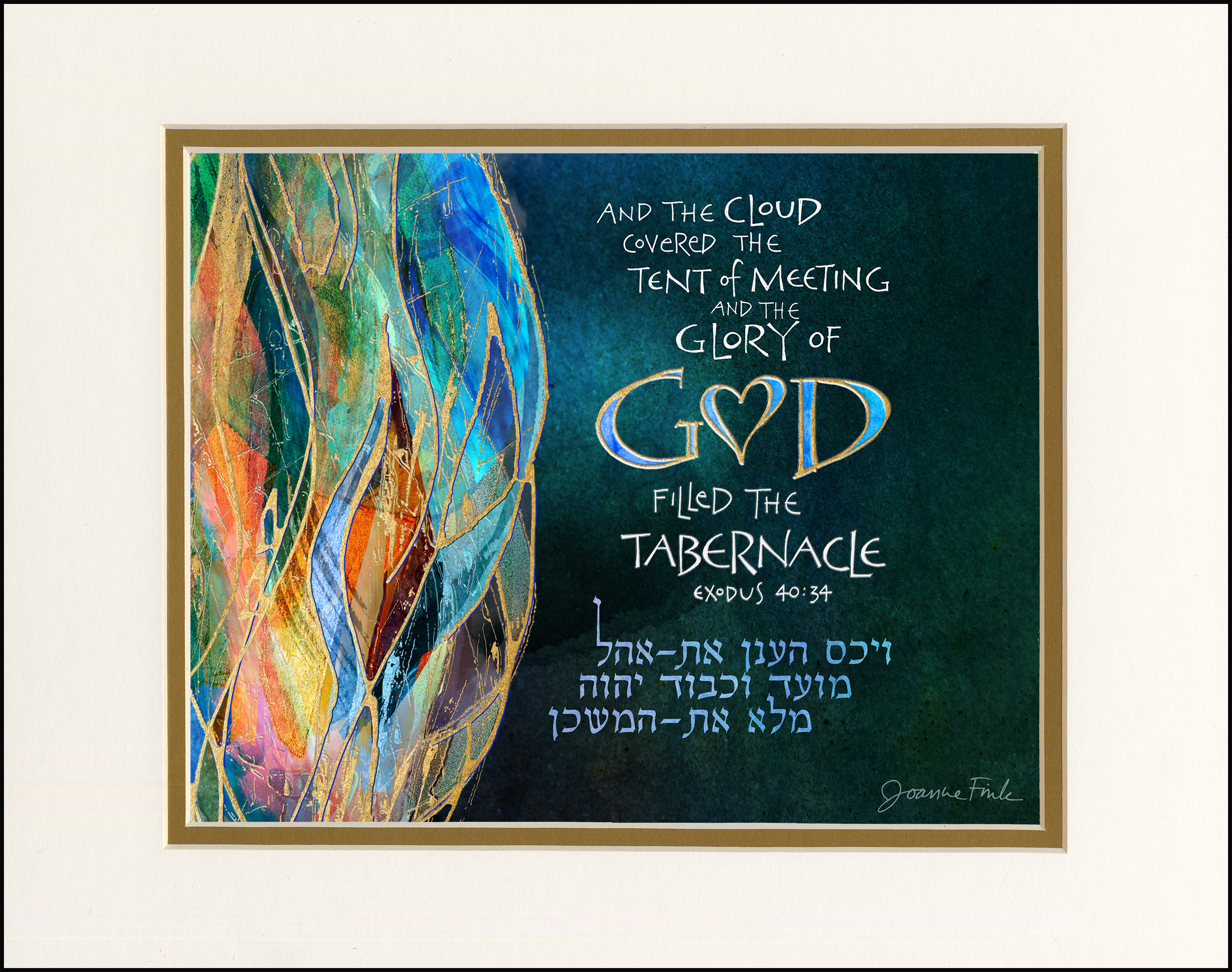This hand-lettered design is the twenty-third of the 54 pieces in Joanne Fink’s Torah Illuminations series. This piece illustrates verse 40:34, from Parasha Pekudei, the last Torah portion in the Book of Exodus, “And the cloud covered the tent of meeting and the glory of God filled the tabernacle.”