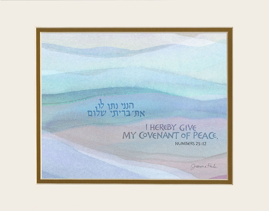 This scenic design is the forty-first of the 54 pieces in Joanne Fink’s Torah Illuminations series. This piece illustrates verse 25:12, from Parasha Pinchas, the eighth Torah portion in the Book of Numbers, “I hereby give him my covenant of peace.”