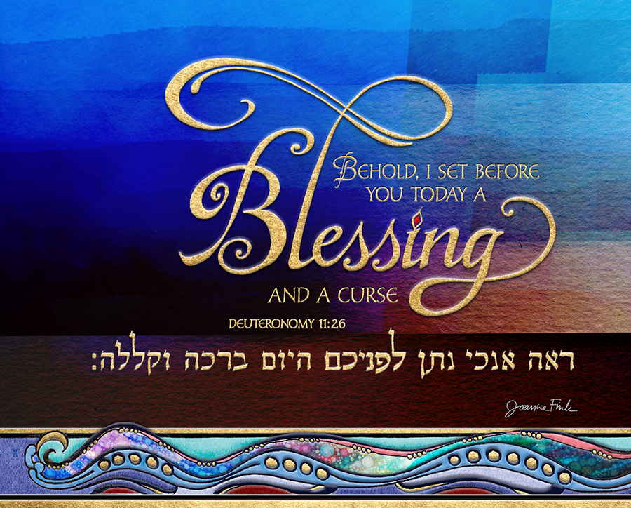 This hand-lettered design is the forty-seventh of the 54 pieces in Joanne Fink’s Torah Illuminations series. This piece illustrates verse 11:26, from Parasha Re’eh, the fourth Torah portion in the Book of Deuteronomy, “Behold I set before you today a blessing and a curse.”