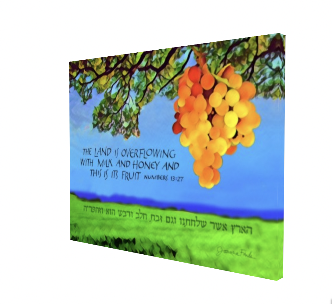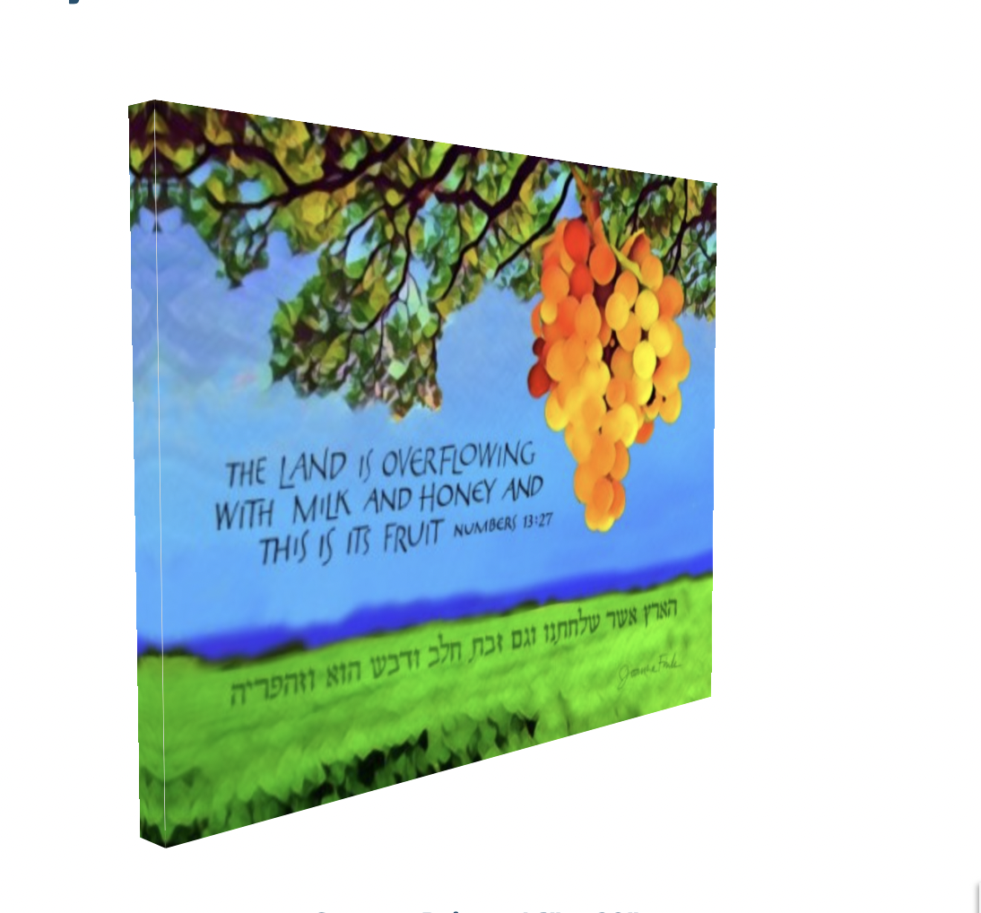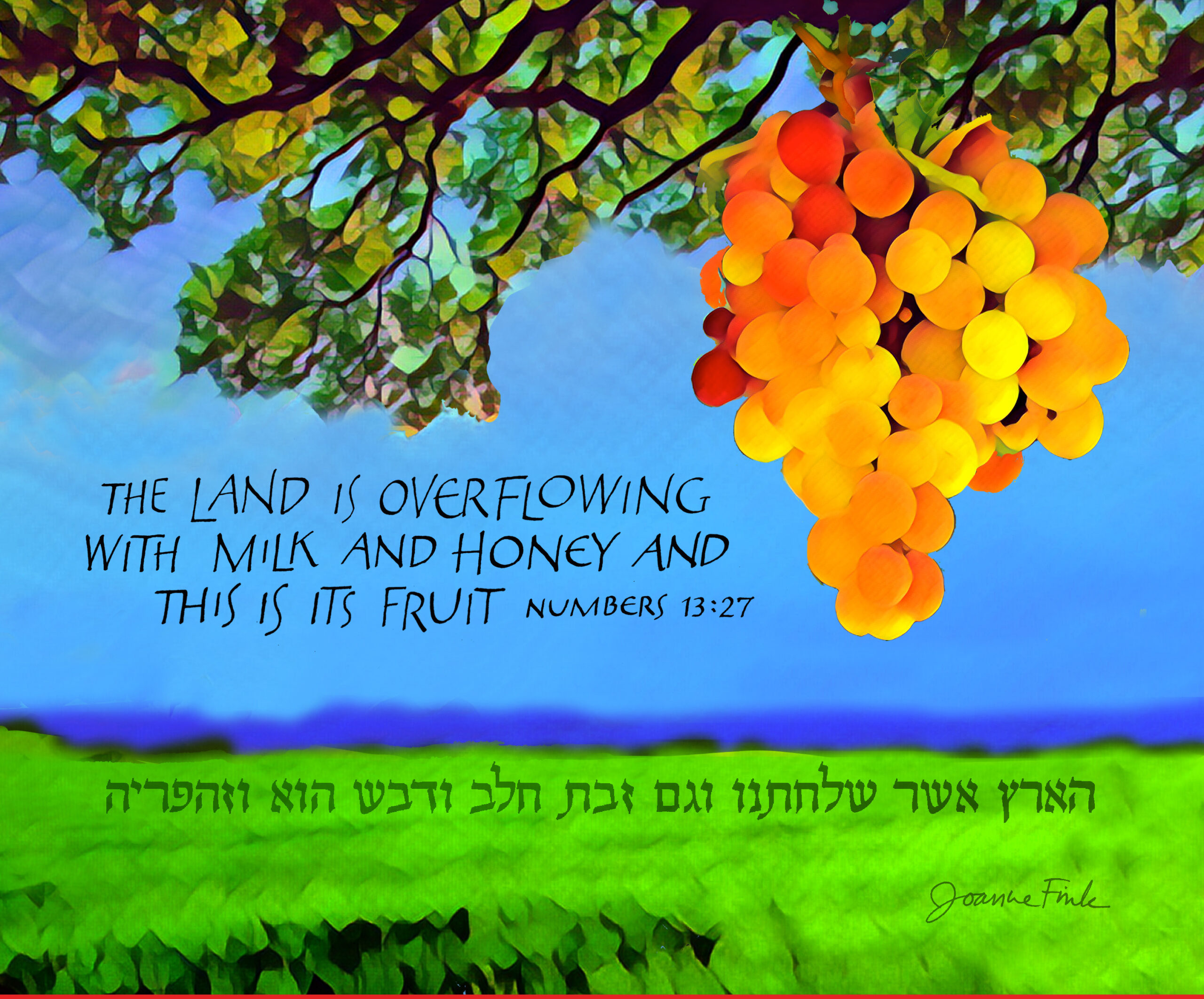 This landscape design is the thirty-seventh of the 54 pieces in Joanne Fink’s Torah Illuminations series. This piece illustrates verse 13:27, from Parasha Shelach, the seventh Torah portion in the Book of Numbers, “The land is overflowing with milk and honey and this is its fruit.”