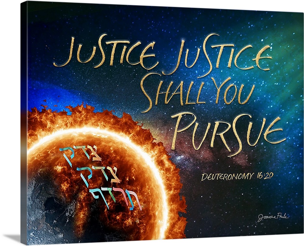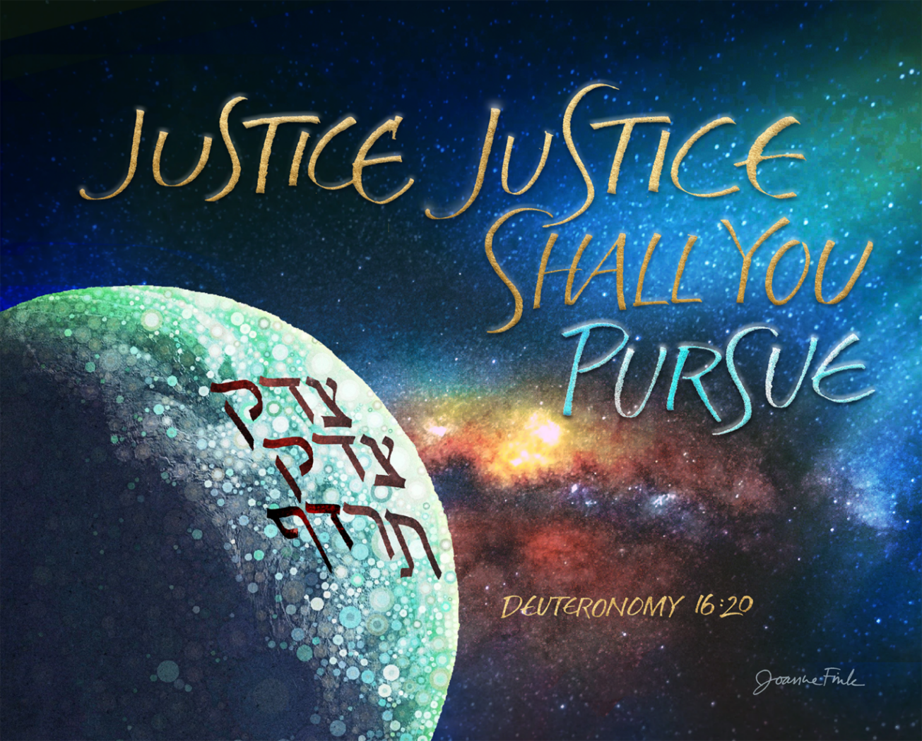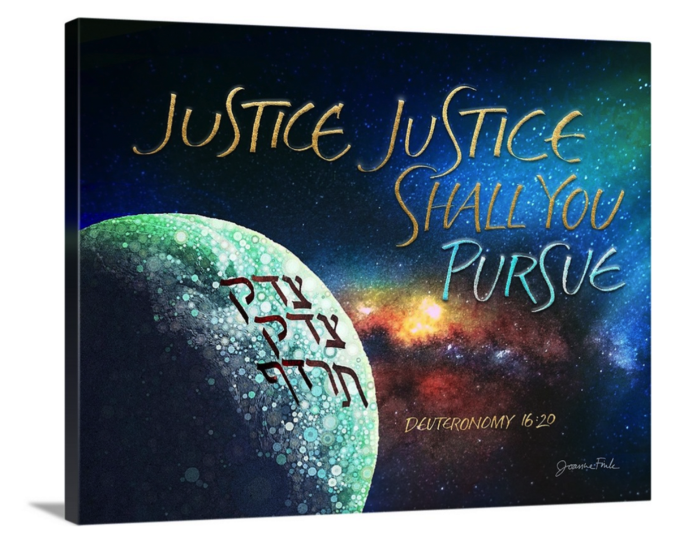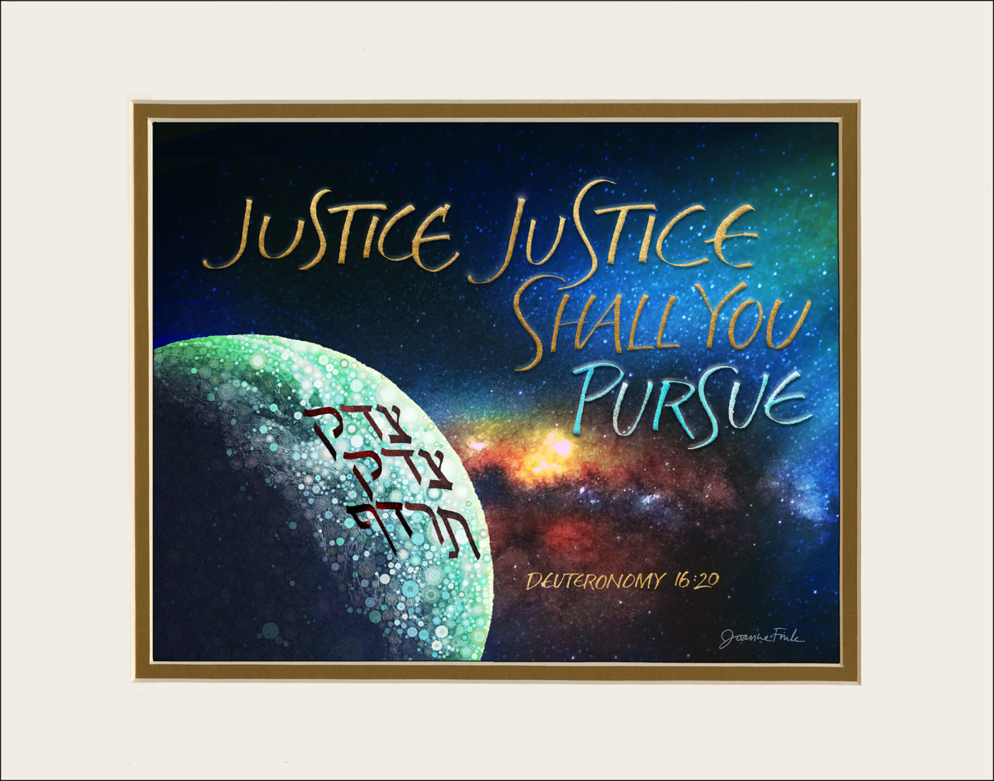 This gorgeous design is the forty-eighth of the 54 pieces in Joanne Fink’s Torah Illuminations series. This piece illustrates verse 16:20, from Parasha Shoftim, the fifth Torah portion in the Book of Deuteronomy, “Justice, Justice shall you pursue.”