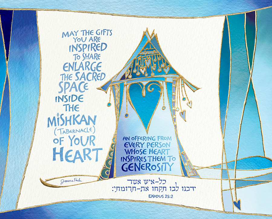This delightful, hand-lettered, design is the nineteenth of the 54 pieces in Joanne Fink’s Torah Illuminations series. This piece illustrates verse 25:2, from Parasha Terumah, the seventh Torah portion in the Book of Exodus, “May the gifts you are inspired to share enlarge the space inside the Mishkan (Tabernacle) of your heart.”