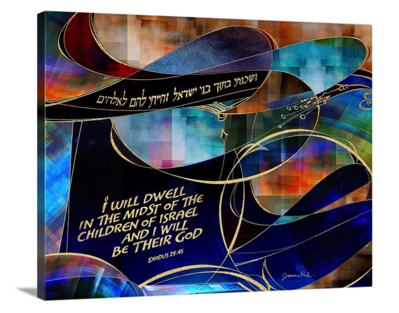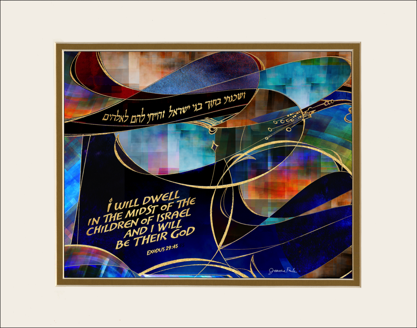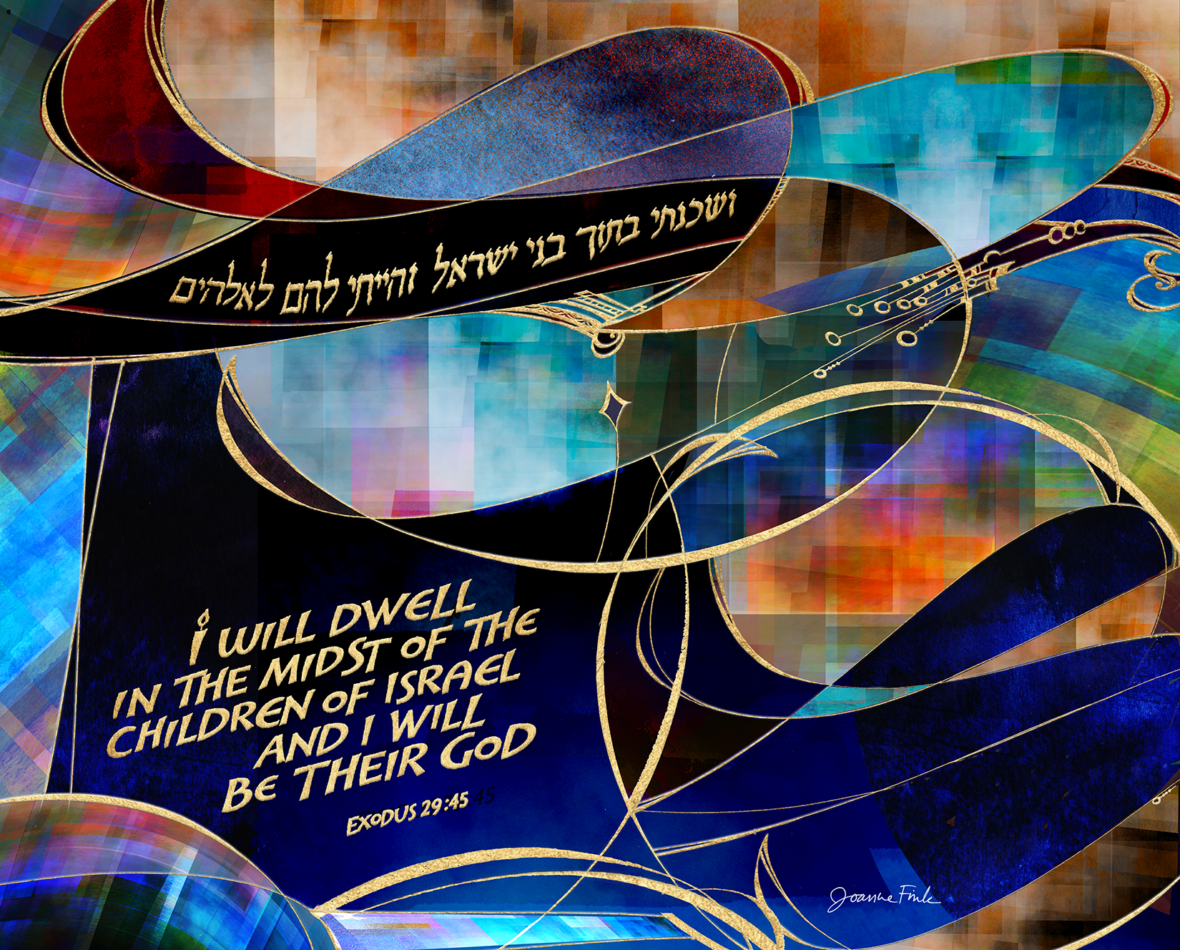 This abstract design is the twentieth of the 54 pieces in Joanne Fink’s Torah Illuminations series. This piece illustrates verse 29:45, from Parasha Tetzaveh, the eighth Torah portion in the Book of Exodus, “I will dwell in the midst of the children of Israel and I will be their God.”