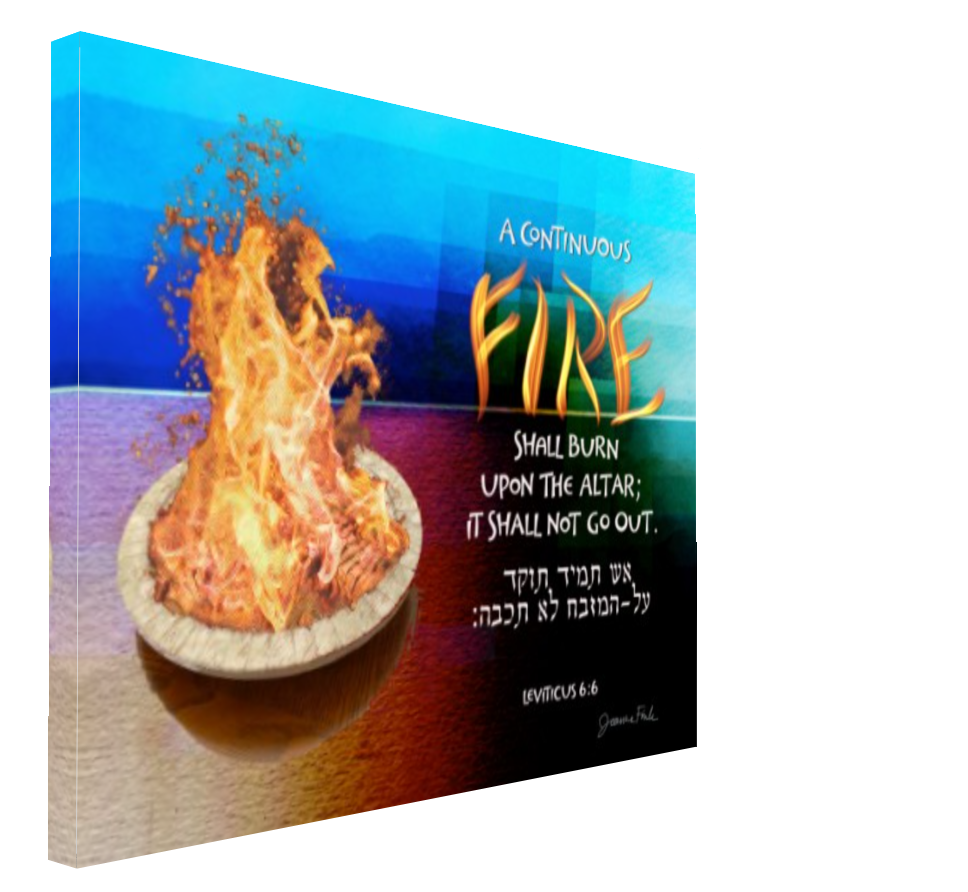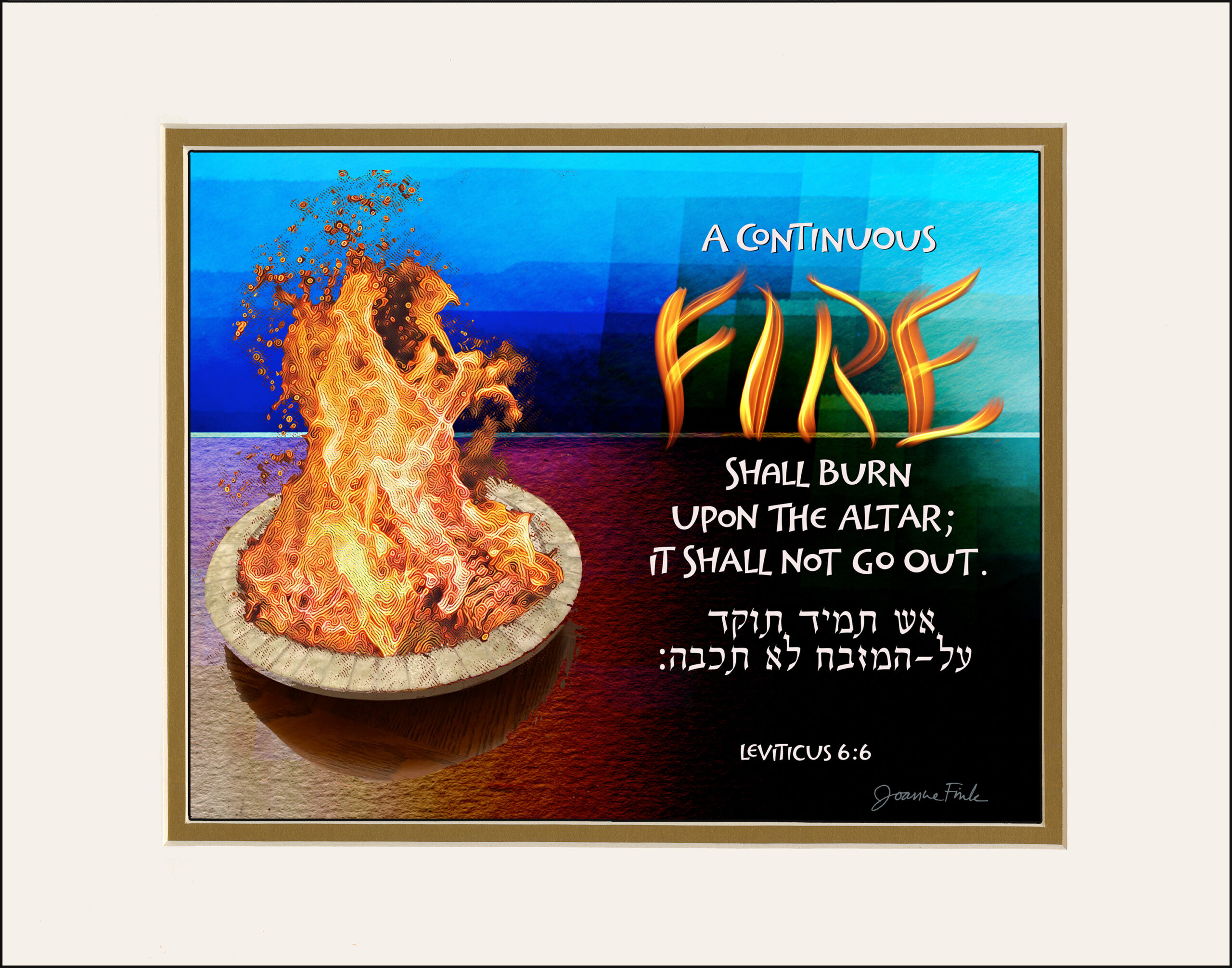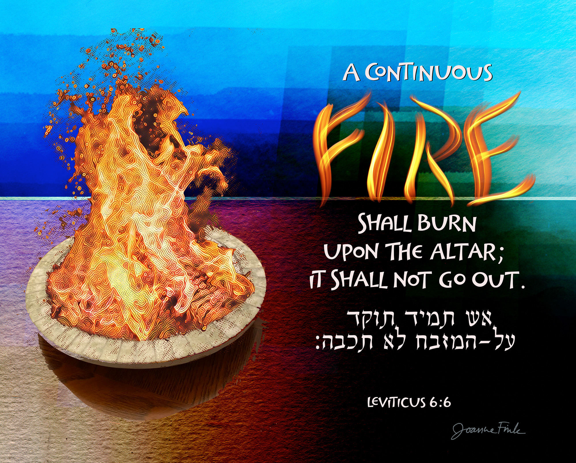 This fiery design is the twenty-fifth of the 54 pieces in Joanne Fink’s Torah Illuminations series. This piece illustrates verse 6:6, from Parasha Tzav, the second Torah portion in the Book of Leviticus, “A continuous fire shall burn upon the altar; it shall not go out.”