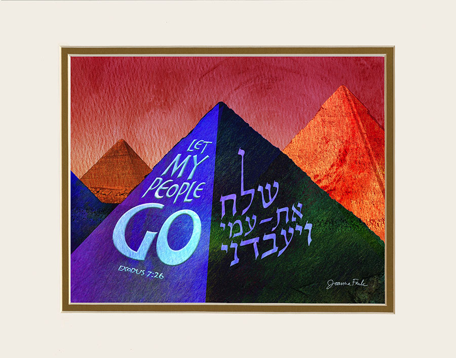 This rich design is the fourteenth of the 54 pieces in Joanne Fink’s Torah Illuminations series. This piece illustrates verse 7:26, from Parasha Va’eira, the second Torah portion in the Book of Exodus, “Let my people go.”