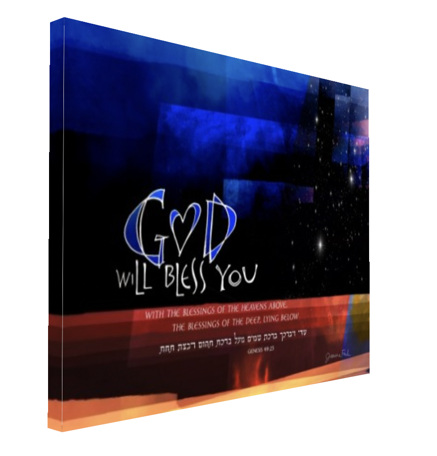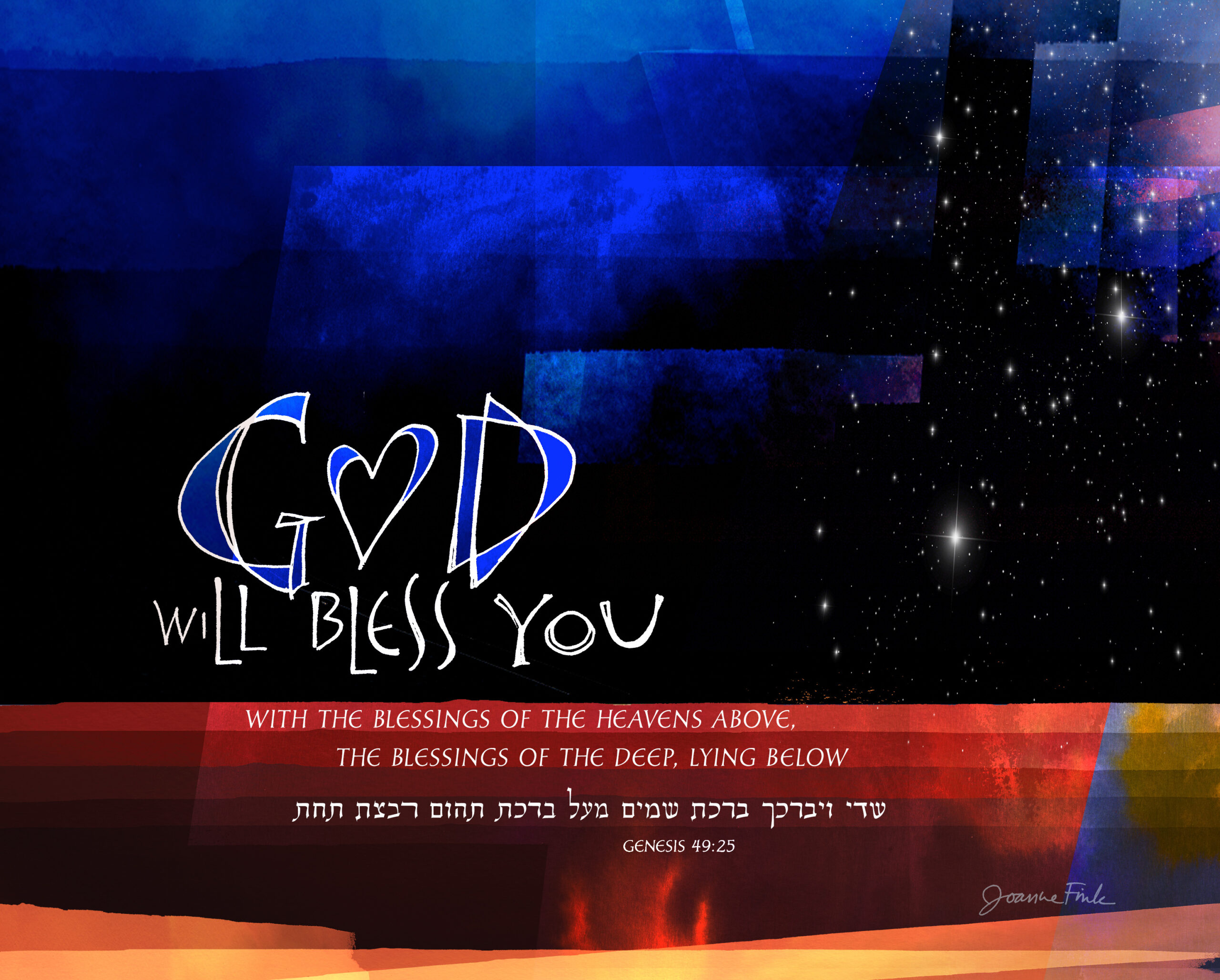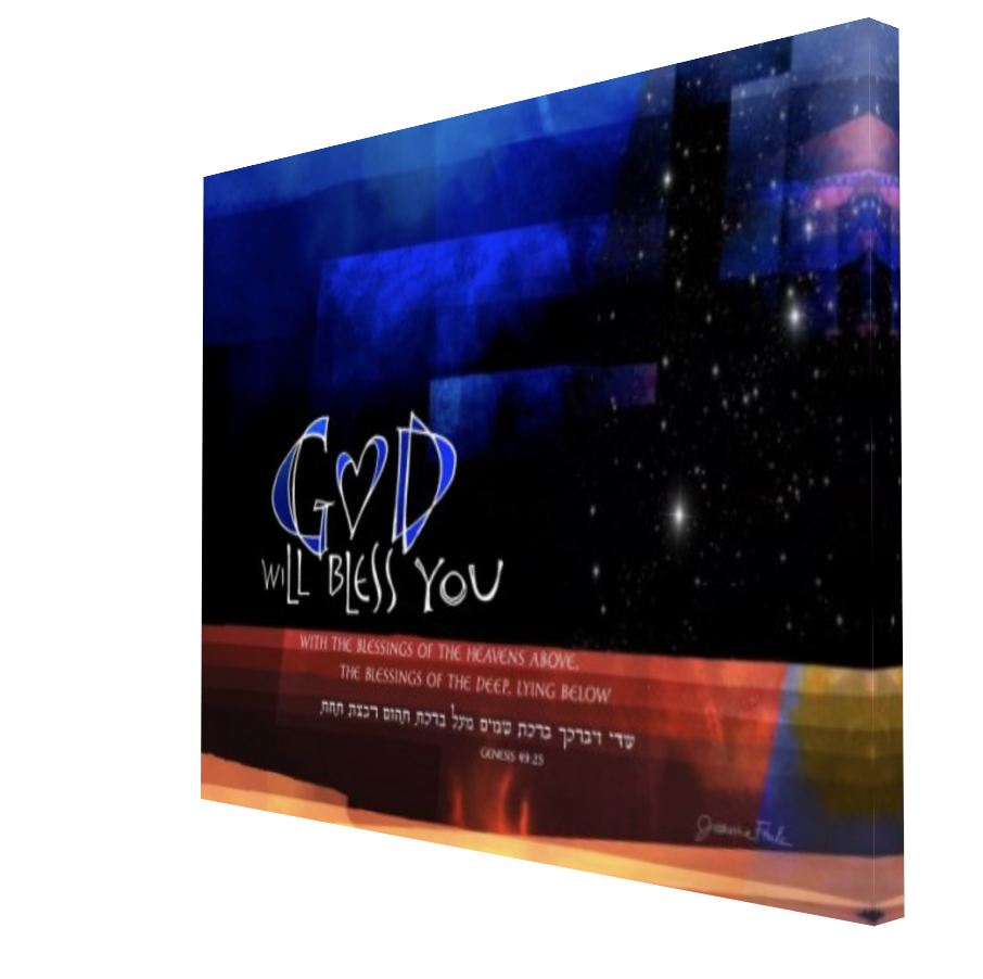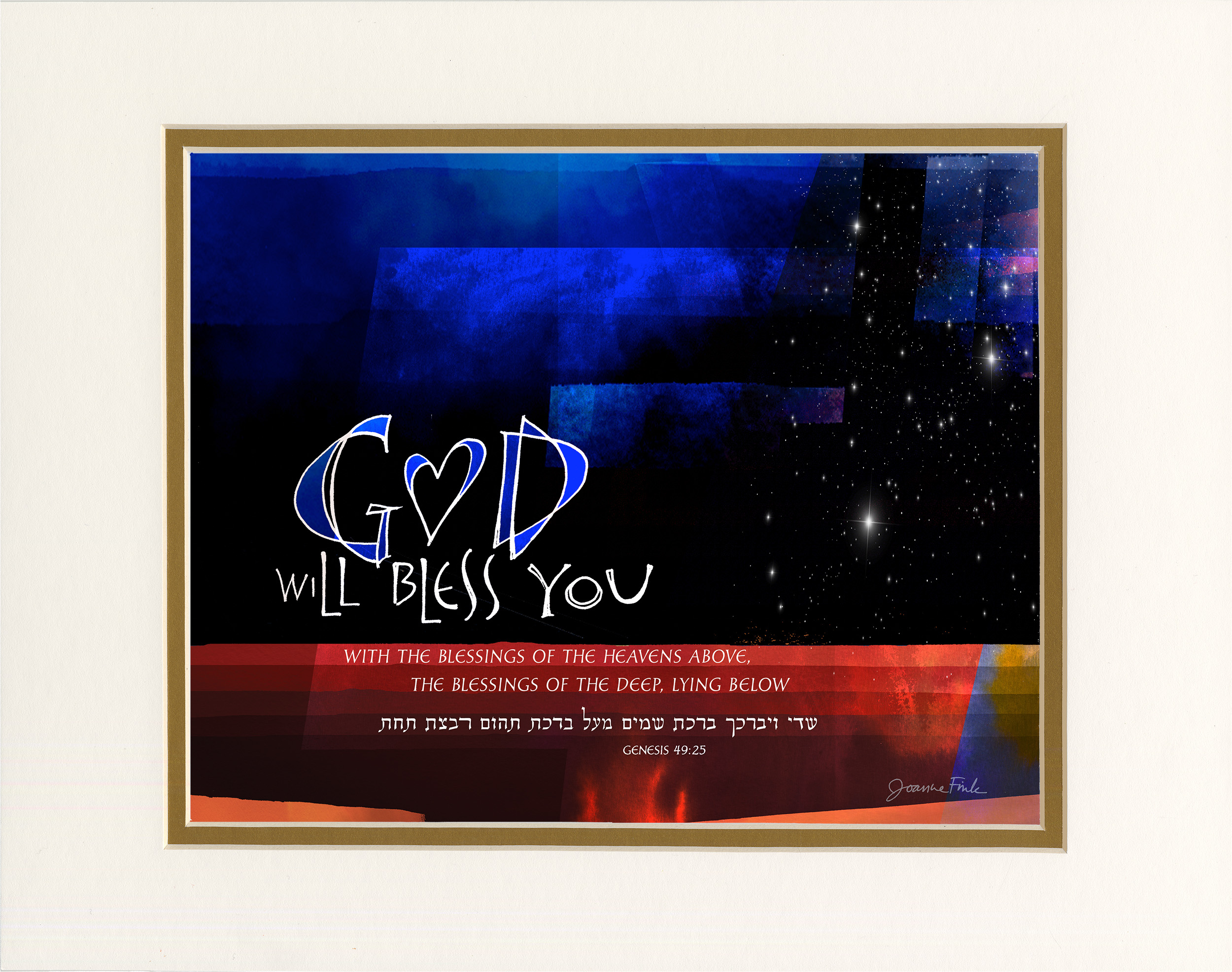 This stunning design is the twelfth of the 54 pieces in Joanne Fink’s Torah Illuminations series. This piece illustrates verse 49:25, from Parasha Vayechi, the last Torah portion in the Book of Genesis, “God will bless you with the blessings of the heavens above, the blessings of the deep, lying below.”