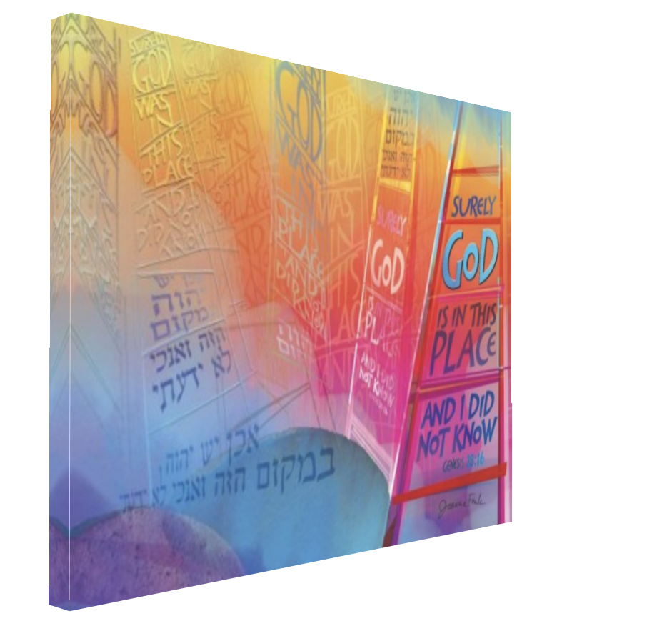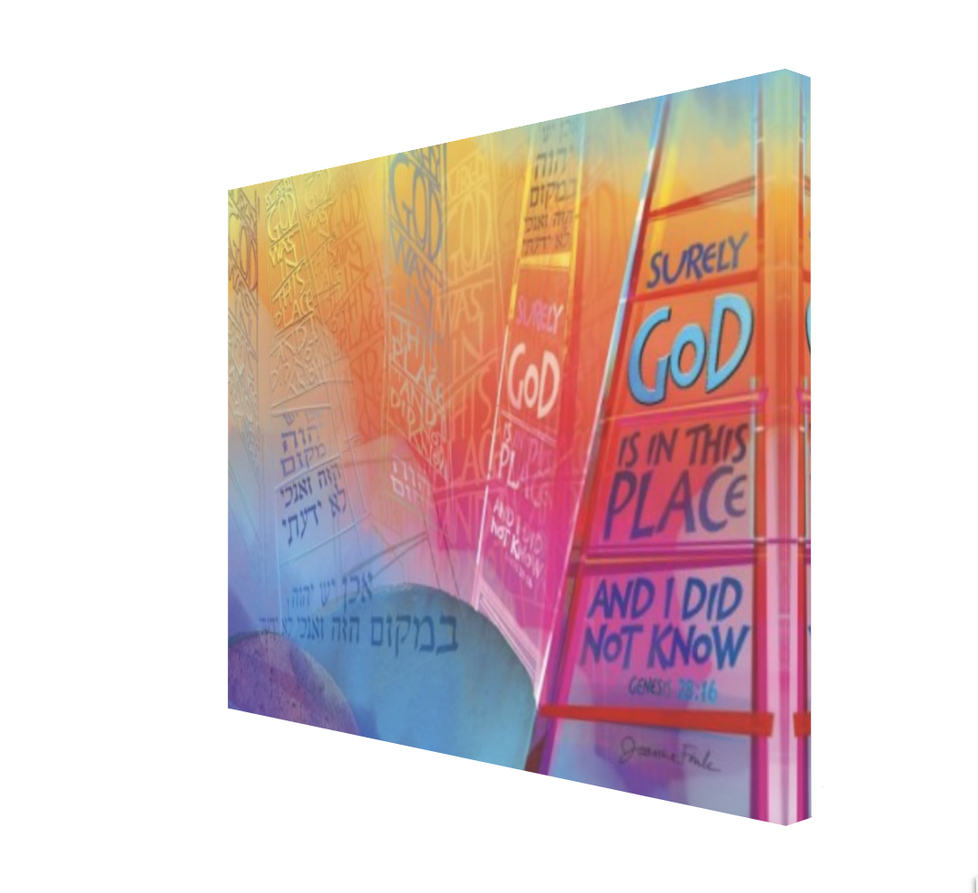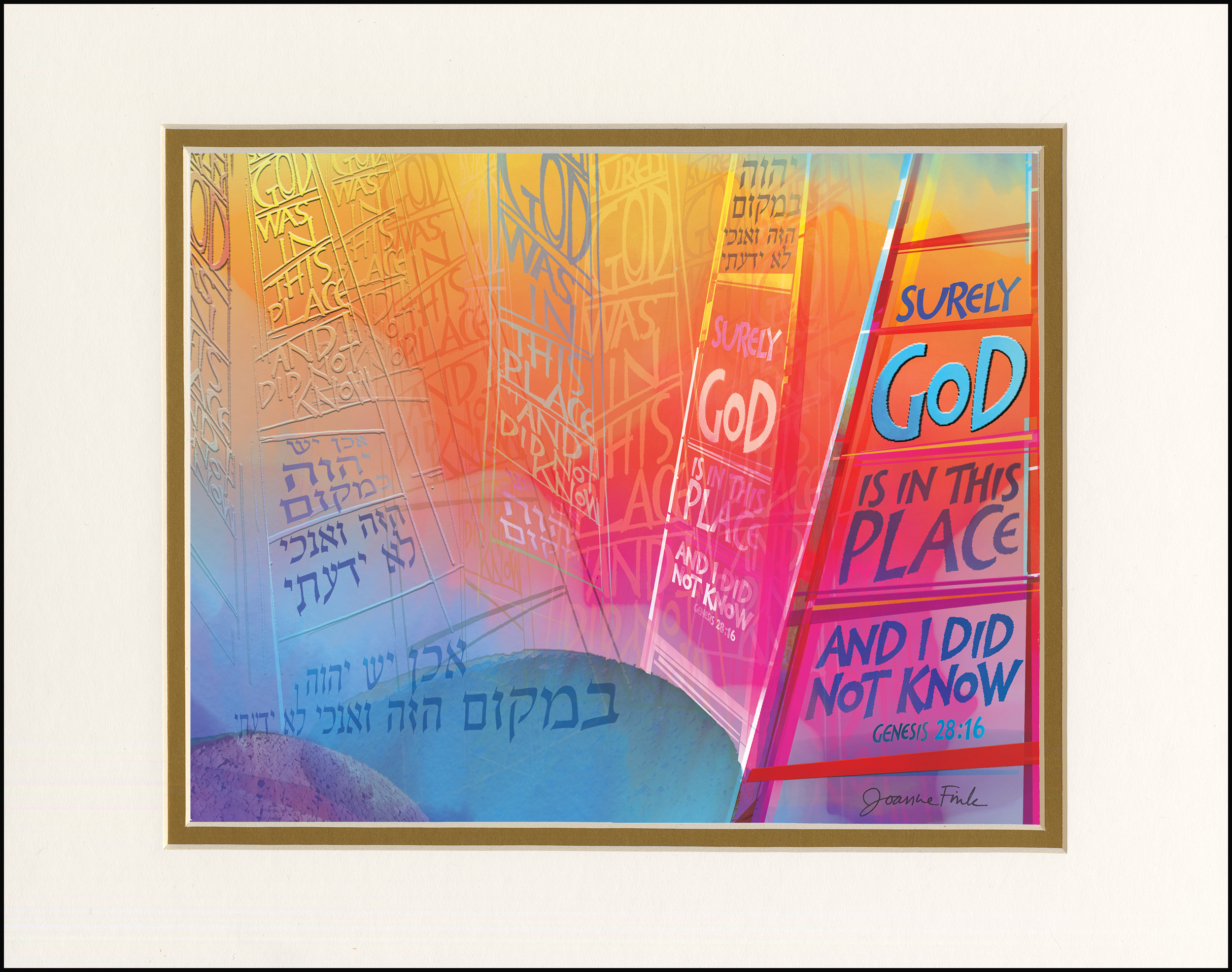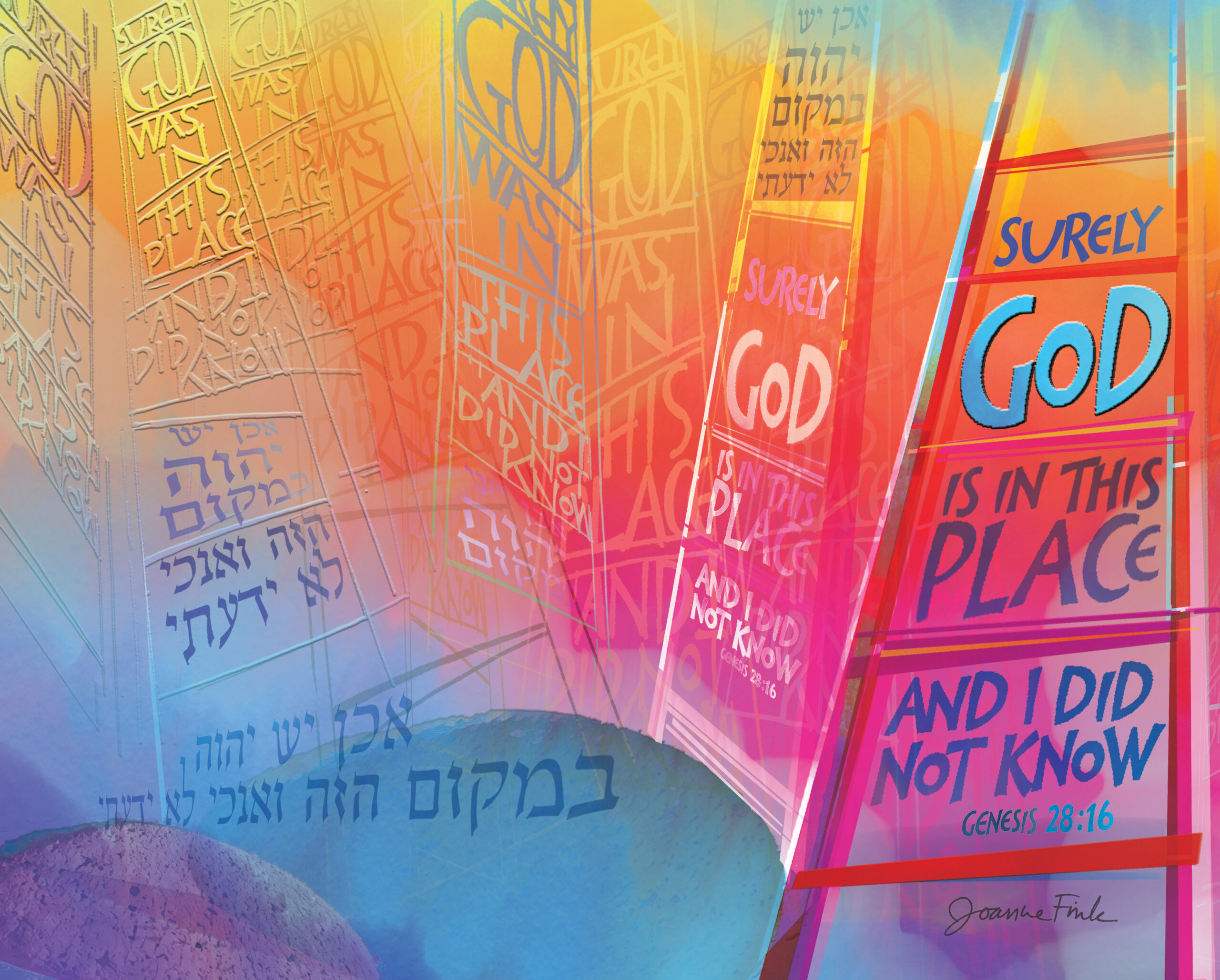 This colorful design is the seventh of the 54 pieces in Joanne Fink’s Torah Illuminations series. This piece illustrates verse 28:16, from Parasha Vayeitzei, the seventh Torah portion in the Book of Genesis, “Surely God is in this place and I did not know.”