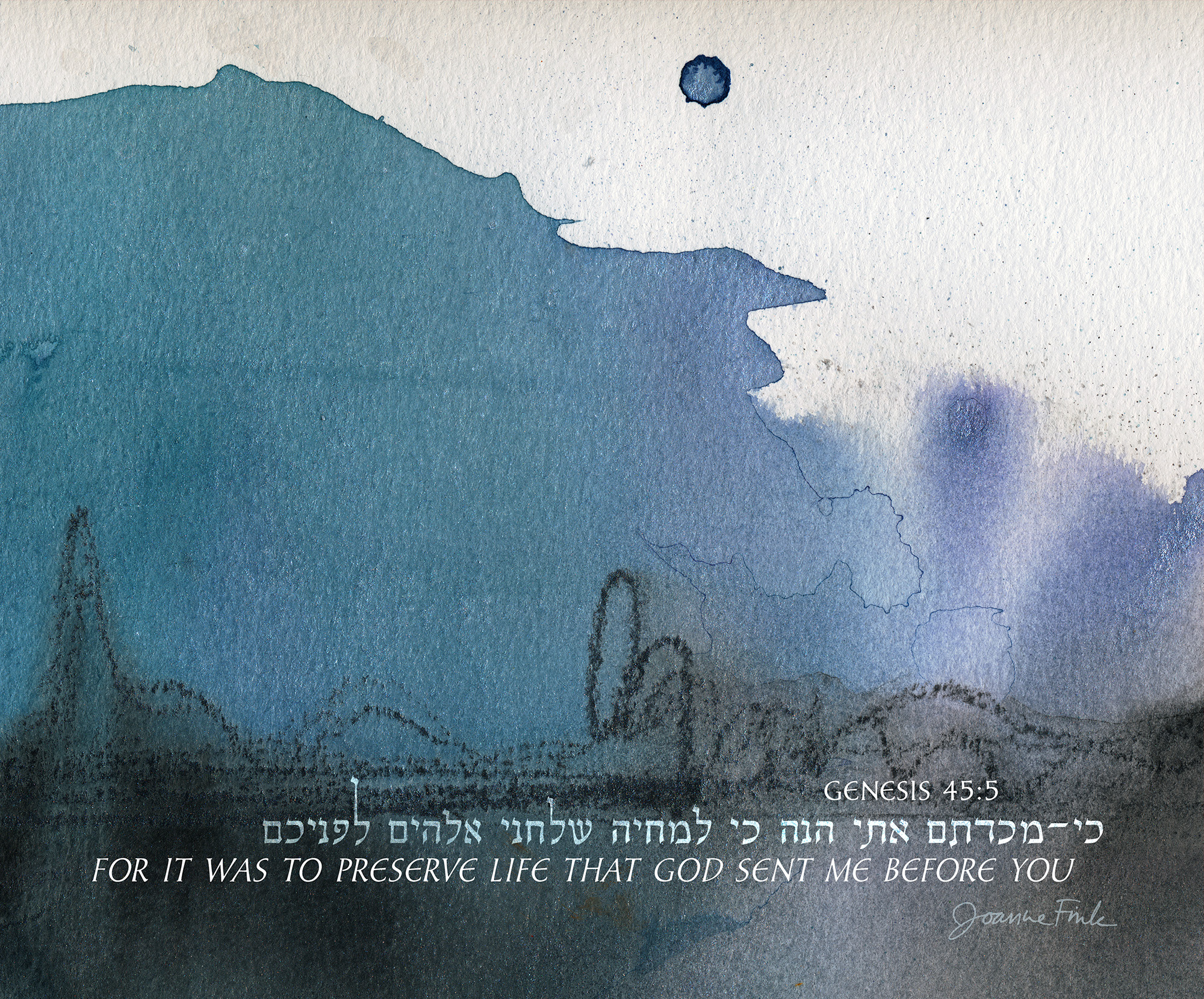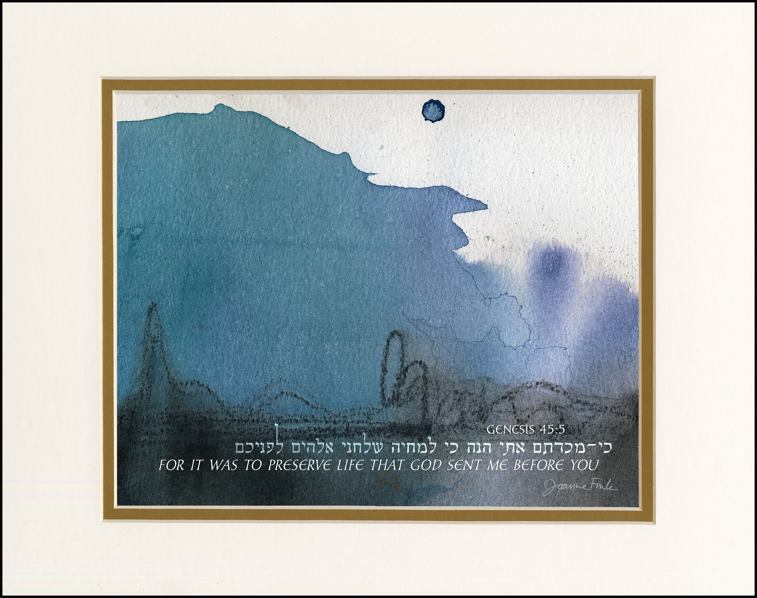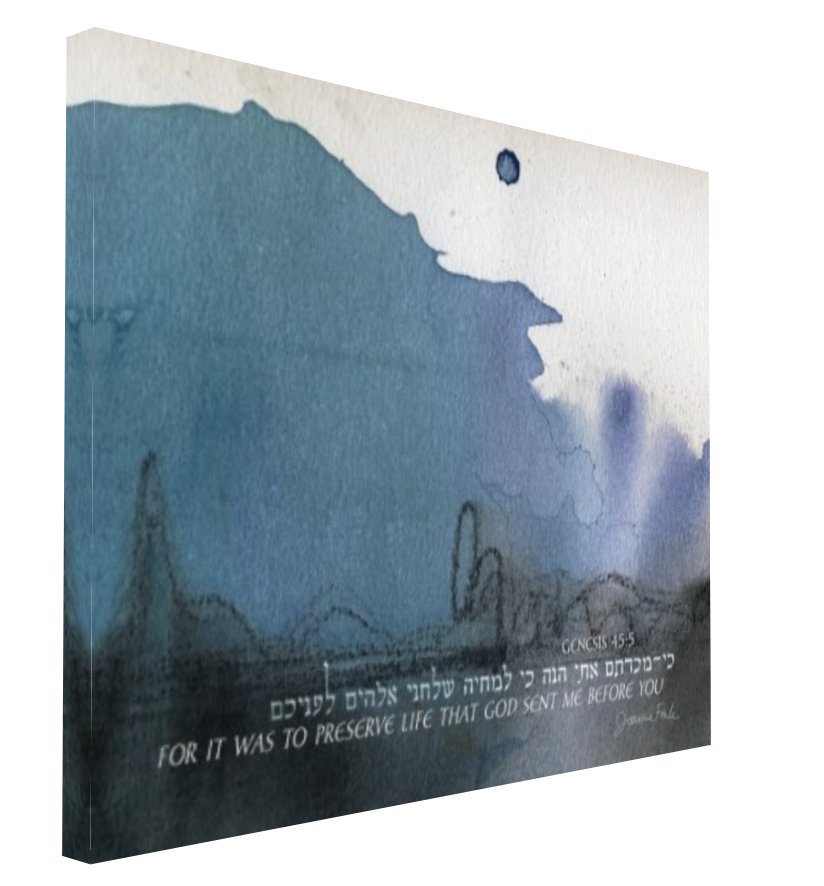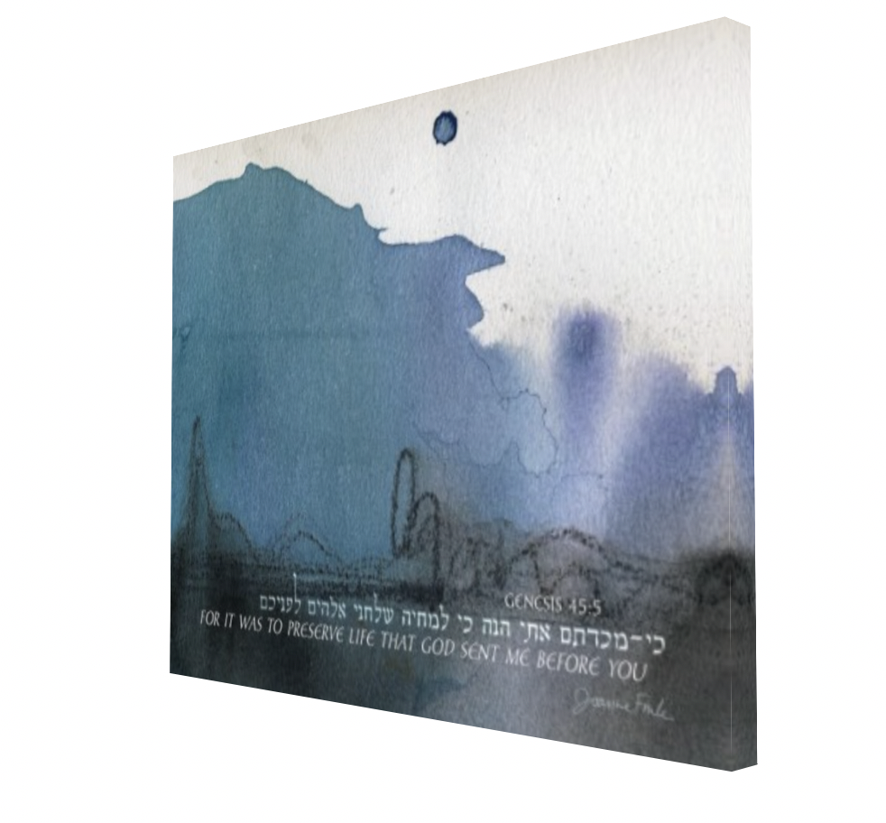This abstract design is the eleventh of the 54 pieces in Joanne Fink’s Torah Illuminations series. This piece illustrates verse 45:5, from Parasha Vayigash, the eleventh Torah portion in the Book of Genesis, “For it was to preserve life that God sent me before you.”
