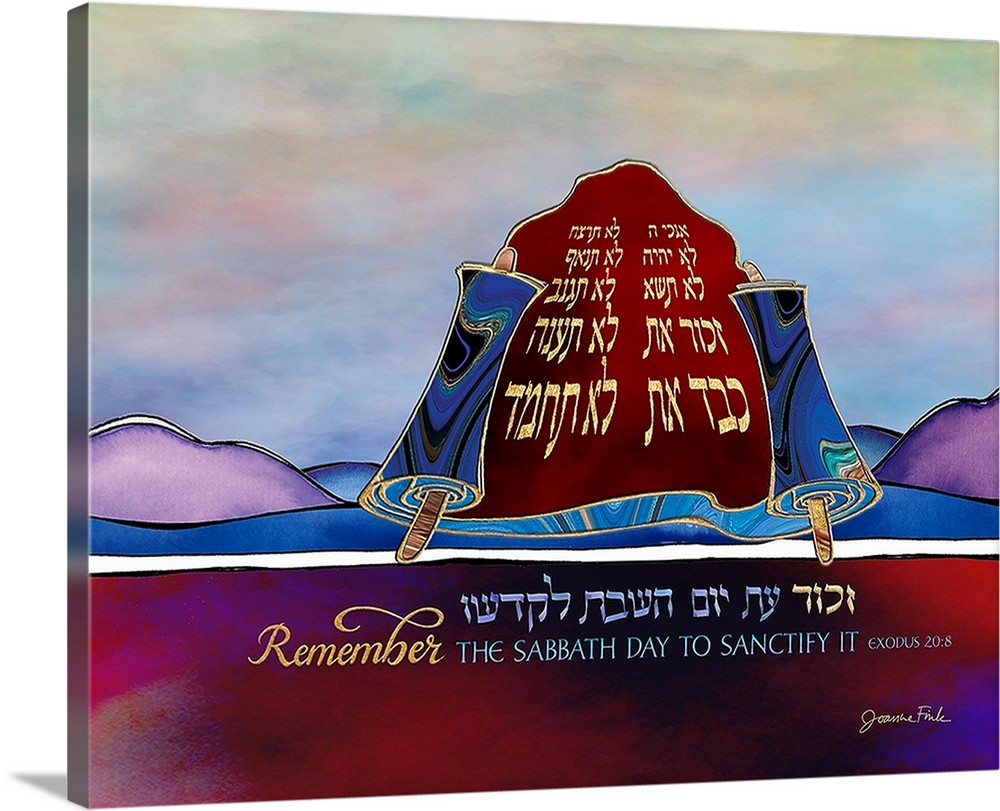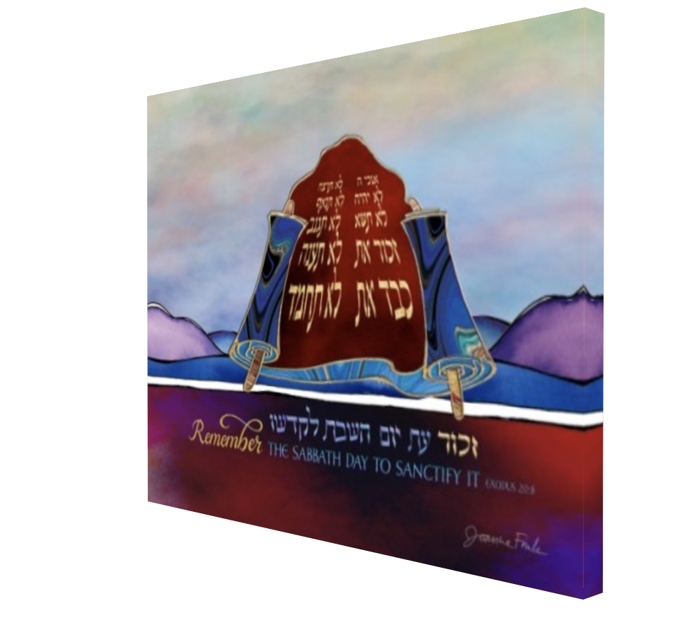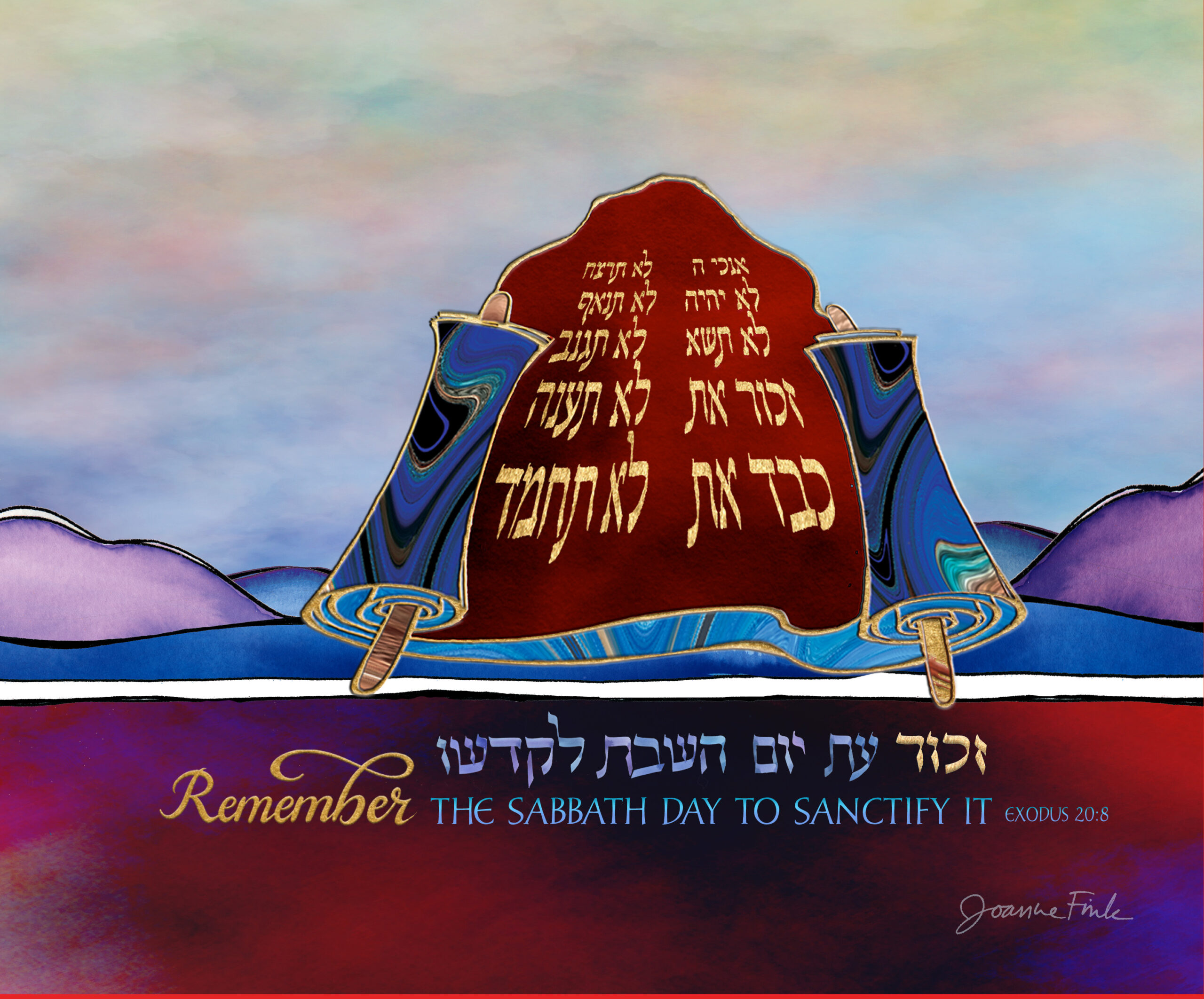 This ethereal design is the seventeenth of the 54 pieces in Joanne Fink’s Torah Illuminations series. This piece illustrates verse 20:8, from Parasha Yitro, the fifth Torah portion in the Book of Exodus, “Remember the Sabbath day to sanctify it.”